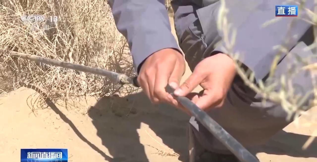 這里的肉蓯蓉能有這樣好的品質(zhì),離不開生態(tài)林的養(yǎng)護(hù)。種植肉蓯蓉的這片防沙林,在三年前還是一片荒漠。在沙漠中,能出現(xiàn)這樣的生命奇跡,得益于當(dāng)?shù)乜茖W(xué)用水。在每一行的梭梭和紅柳的根部都有滴灌帶,因?yàn)楝F(xiàn)在是肉蓯蓉采收季,所以滴灌帶里沒有水。這些滴灌設(shè)施,在沙漠里發(fā)揮節(jié)水灌溉的作用,讓生態(tài)林扎根成活,讓肉蓯蓉得以生長(zhǎng)。