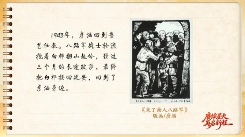 1943年,彥涵回到魯藝任教。八路軍戰(zhàn)士輪流抱著白樺翻山越嶺,經(jīng)過三個月的長途跋涉,最終把白樺接回延安,回到了彥涵身邊。
