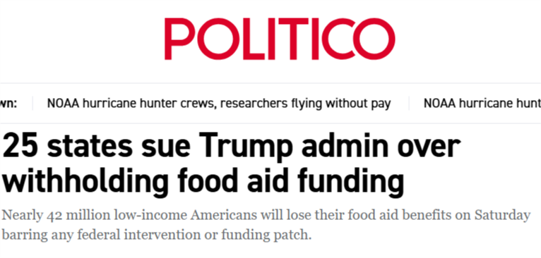 據(jù)美國《政治報(bào)》網(wǎng)站報(bào)道,受政府持續(xù)“停擺”影響,美農(nóng)業(yè)部宣布暫停其“補(bǔ)充營(yíng)養(yǎng)援助計(jì)劃”(SNAP),11月1日起停止發(fā)放食品救濟(jì)。目前這一項(xiàng)目覆蓋約4200萬人,約占美國總?cè)丝诎朔种唬渲卸鄶?shù)為低收入群體和殘障人士。SNAP項(xiàng)目暫停后,他們的生活將難以為繼。當(dāng)?shù)貢r(shí)間28日,民主黨主政的25個(gè)州和首都華盛頓對(duì)聯(lián)邦政府提起訴訟,要求動(dòng)用聯(lián)邦應(yīng)急資金,以維持這一項(xiàng)目。