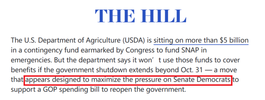 對(duì)此,美國《國會(huì)山報(bào)》直言,農(nóng)業(yè)部種種說辭顯然為了最大限度地向參議院民主黨人施壓,迫使他們支持共和黨的支出法案,以重啟政府。