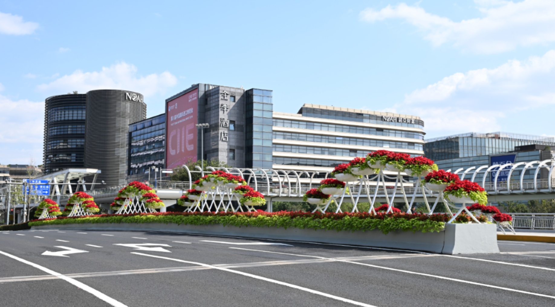 連通虹橋國際中央商務(wù)區(qū)與進(jìn)博會主場館的二層步廊,是參展賓客的重要通道之一,精心布置的花箱、草花,烘托出熱情洋溢的迎賓氛圍。位于嘉閔高架建虹路下匝口的“一帶一路”“大進(jìn)寶”用一抹嫣紅迎接進(jìn)博客商;虹許路虹橋路口的“花珠匯海”以及不遠(yuǎn)處的“虹橋之眼”喜迎各方嘉賓;處在小陸家嘴環(huán)島中心的“開放之門”向世界訴說著改革開放的上海故事?!吧曜中巍备呒艽蛟斓摹翱罩谢ɡ取鄙鷻C(jī)盎然,三角梅、亮金女貞、六道木等花卉通過科學(xué)養(yǎng)護(hù)與花期調(diào)控,確保進(jìn)博會期間保持最佳觀賞狀態(tài)。上海全市170條主要道路干凈整潔,60個(gè)景觀區(qū)域美觀宜人,黃浦江、蘇州河清波蕩漾,全方位展現(xiàn)上海的城市環(huán)境品質(zhì)。