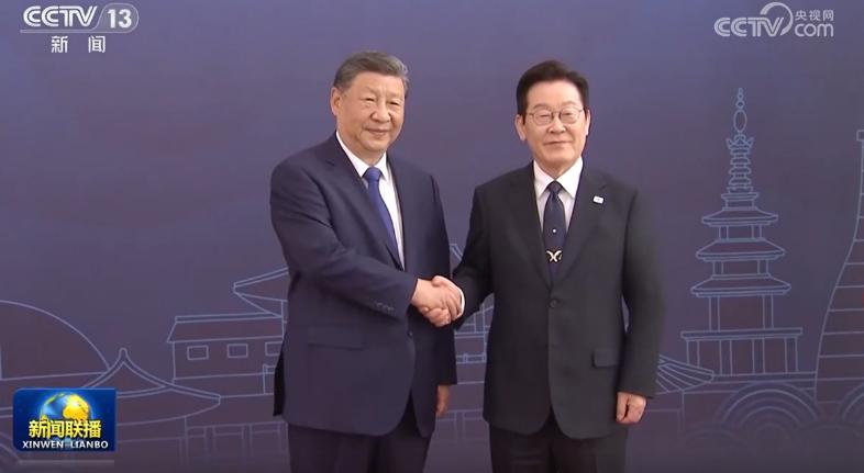 李在明熱情迎接習(xí)近平。兩國(guó)元首握手合影。