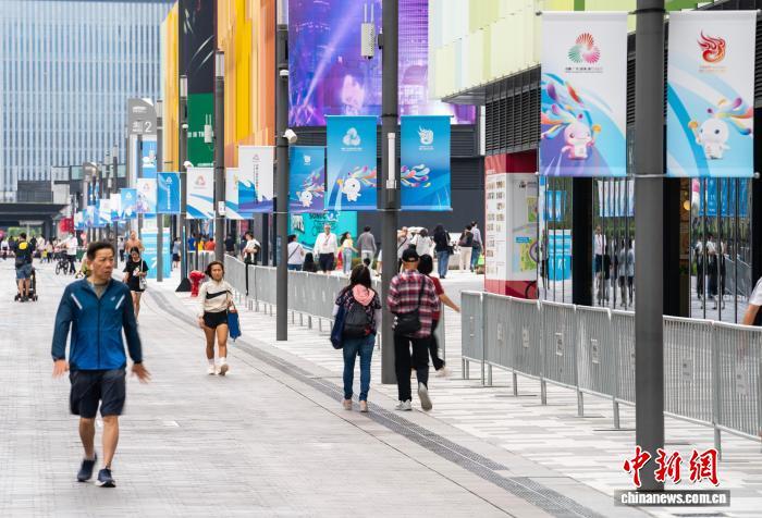 11月1日,香港新晉地標啟德體育園的體育大道沿途遍布第十五屆全國運動會(簡稱“十五運會”)裝飾宣傳元素,靜待本屆全運會于11月9日正式開幕。圖為體育大道沿線懸掛將于11月2日舉行的十五運會香港賽區(qū)火炬?zhèn)鬟f活動的裝飾宣傳物料。 中新社記者 侯宇 攝