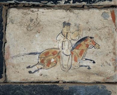 它的“不一般”,首先在于其“極簡卻傳神”的藝術(shù)風(fēng)格。該磚的畫面以赭石色為底,墨線寥寥,卻生動(dòng)勾勒出一位策馬疾馳的驛使:頭戴魏晉幘帽,身著右衽短衫,左手控韁,右手舉著文書。而駿馬則四蹄騰空,動(dòng)態(tài)感十足,一種風(fēng)馳電掣的緊迫感似從畫中撲面而來。更耐人尋味的是,畫師刻意省略了驛使的嘴巴:這一“殘缺”設(shè)計(jì),并非疏忽,而是古人智慧的體現(xiàn),象征著郵驛制度中“守口如瓶”的保密原則,使其成為中國古代信息保密文化的生動(dòng)見證。
