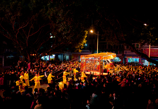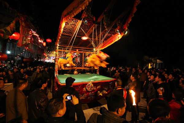 線獅表演中,獅子朝舞臺左右飛去的動(dòng)作,稱為“穿山躍”。其動(dòng)作幅度之大、速度之快,令人稱奇。受訪者供圖 霍童線獅是寧德的傳統(tǒng)民俗文化項(xiàng)目,數(shù)條繩索構(gòu)成了線獅的“神經(jīng)系統(tǒng)”,表演者在后臺拉線操控,加上繡球、燈光、噴火、鑼鼓的配合,帶給觀眾惟妙惟肖的享受。 歷經(jīng)十幾代傳承人的改良創(chuàng)新,霍童線獅由最初的“單獅”,發(fā)展成4種表演形式;表演時(shí)呈現(xiàn)出坐立、蹲臥、跳躍、翻騰、擺首、舐毛、搶球等更多姿態(tài),配以新興的聲、光、電效果,表演引人入勝。除了盲視表演,霍童線獅的制作工序同樣為人稱道。一只線獅從準(zhǔn)備原材料到最終完工,大致需要“搭骨架、火烤、填充、定型、上色、裝飾”等多個(gè)步驟,如此大大小小的工序做下來,就算是老藝人也要一個(gè)月方能完成。 2006年,霍童線獅入選國家級非物質(zhì)文化遺產(chǎn)名錄后,霍童建設(shè)了線獅館。相比過去僅在燈會(huì)上一年神秘地露臉一次,如今線獅有了更為廣闊的舞臺。每天中午,陳姓、黃姓兩大家族的藝人在線獅館內(nèi)輪流登臺,一周表演6天,迎接來自五湖四海的游客。線獅的傳承也打破了“傳男不傳女”“傳內(nèi)不傳外”的規(guī)定。如今,霍童當(dāng)?shù)氐膶W(xué)校正大力推廣線獅進(jìn)校園活動(dòng)并邀請線獅隊(duì)的老藝人擔(dān)任輔導(dǎo)老師,加大裝備投入、每周開展相應(yīng)的活動(dòng),為傳統(tǒng)線獅注入活力。 |