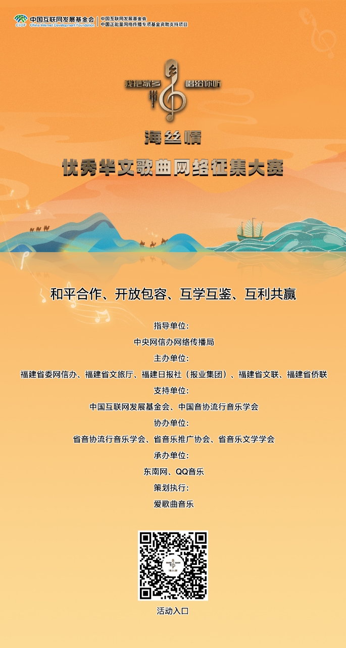 日前,由中央網(wǎng)信辦網(wǎng)絡(luò)傳播局指導(dǎo),福建省委網(wǎng)信辦、福建省文旅廳、福建日報社(報業(yè)集團)、福建省文聯(lián)、福建省僑聯(lián)等主辦的“海絲情·我把家鄉(xiāng)唱給你聽”優(yōu)秀華文歌曲網(wǎng)絡(luò)征集大賽正式啟動,傳承絲路精神,弘揚絲路文化。活動得到了中國互聯(lián)網(wǎng)發(fā)展基金會中國正能量網(wǎng)絡(luò)傳播專項基金資助支持。 “海絲情·我把家鄉(xiāng)唱給你聽”優(yōu)秀華文歌曲網(wǎng)絡(luò)征集大賽,以音樂為紐帶,將面對華人、華僑音樂愛好者群體和沿線國家音樂唱作人,通過網(wǎng)絡(luò)的方式征集、展播、評審優(yōu)秀音樂作品和線下采風、研討、頒獎活動,增強“一帶一路”沿線國家音樂唱作人原創(chuàng)音樂創(chuàng)作的交流,為音樂人搭建起一座通往世界的廣闊舞臺,為網(wǎng)民展示一個多樣化的全球視聽盛宴。