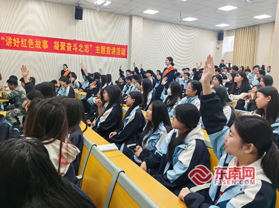 紅色問題提問環(huán)節(jié),學(xué)生們踴躍舉手回答問題。謝吉柳 供圖 由中共泉州市委市直機(jī)關(guān)工作委員會、中共泉州市委黨史和地方志研究室、中共泉州市委講師團(tuán)、泉州市退役軍人事務(wù)局聯(lián)合主辦,中共惠安縣委縣直機(jī)關(guān)工作委員會、中共惠安縣委黨史和地方志研究室、惠安縣退役軍人事務(wù)局、惠安縣人力資源和社會保障局、泉州市云揚航空職業(yè)技術(shù)學(xué)校共同承辦的“講好紅色故事 凝聚奮斗之志”主題宣講活動在泉州市云揚航空職業(yè)技術(shù)學(xué)校舉行?;顒油ㄟ^贈書、紅色故事宣講、紅色知識問答、參觀黨史教育基地等形式,為師生們帶來了一場紅色精神的洗禮。