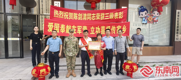 送喜報(bào) 東南網(wǎng)5月6日訊(通訊員 曾德喜 李琳 文/圖)為弘揚(yáng)擁軍優(yōu)屬的光榮傳統(tǒng),營(yíng)造軍屬光榮的濃厚氛圍,近日,莆田市城廂區(qū)退役軍人事務(wù)局聯(lián)合區(qū)人武部、街道武裝部、退役軍人服務(wù)站一同前往東海鎮(zhèn)、霞林街道,為3位榮立三等功(三級(jí)表彰)的軍人家庭送去立功喜報(bào),與軍屬分享榮耀及喜悅。 每到一處,送喜報(bào)小組都向立功現(xiàn)役軍人家屬佩戴綬帶、送上立功喜報(bào)和慰問(wèn)金,并與軍屬們親切交談,詳細(xì)了解他們的家庭生活狀況,對(duì)軍屬們的大力支持致以崇高敬意,感謝他們?yōu)閲?guó)防建設(shè)培養(yǎng)優(yōu)秀人才。