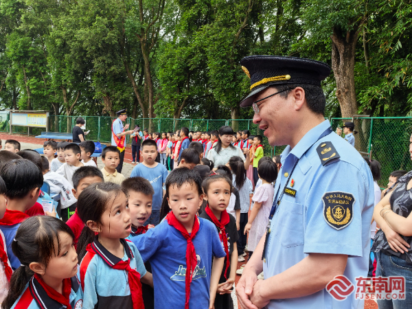 活動現場。寧德高速執(zhí)法支隊供圖 在展板講解結束后,三名執(zhí)法人員來到操場,為五個低年級班級開展面對面互動宣講??紤]到低年級學生的認知特點,他們用生動形象的語言和豐富的肢體動作,耐心講解行人禁止進入高速公路的規(guī)定、高速公路常見標識的含義,并重點科普了黑車的定義和非法營運的嚴重后果?!盀槭裁葱腥瞬荒茈S意進入高速公路?”“非法營運車輛和正規(guī)出租車有什么區(qū)別?”一個個貼近生活的問題,引發(fā)了孩子們的熱烈討論。