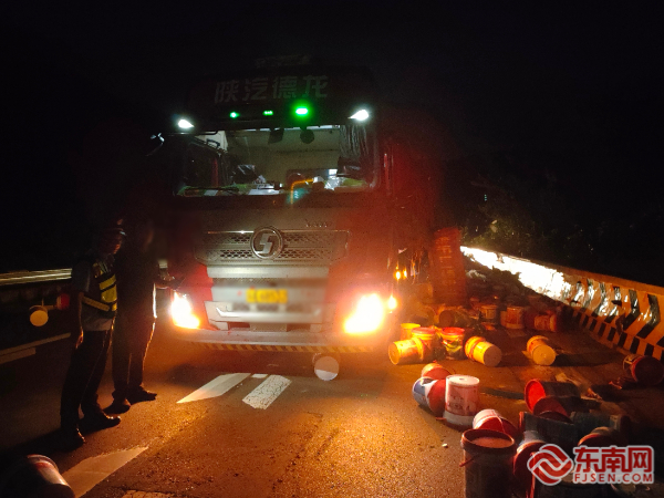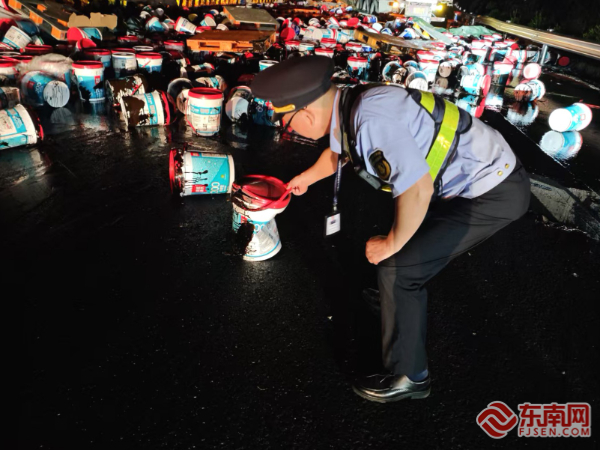 事故現(xiàn)場。寧德高速執(zhí)法支隊供圖 經(jīng)6小時連續(xù)奮戰(zhàn),至次日凌晨5時許,現(xiàn)場散落的1800余桶貨物全部安全轉(zhuǎn)運,污染路面完成徹底清潔。壽寧中隊執(zhí)法人員同步完成路產(chǎn)勘驗,對受損的路面及設(shè)施進行詳細核查登記。為確保行車安全,避免殘留涂料導(dǎo)致打滑,現(xiàn)場仍暫時實施交通管制,待進一步檢查確認安全后恢復(fù)通行。