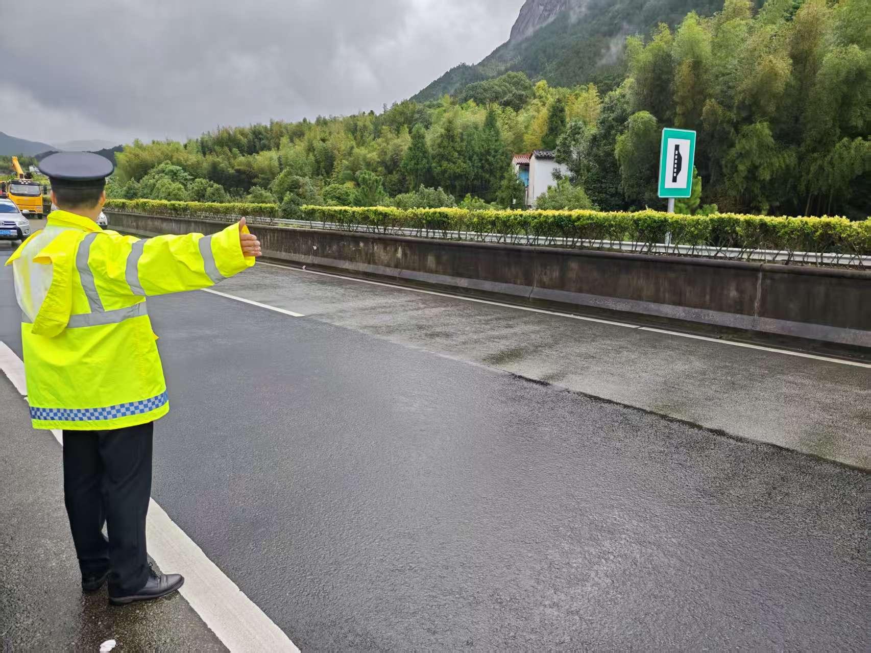 執(zhí)法人員協(xié)助疏導交通。寧德高速公路行政執(zhí)法支隊供圖 與此同時,另一名執(zhí)法人員主動引導后方來車減速避讓,有序開展交通疏導工作,最大限度減少事故對高速通行的影響。在做好現(xiàn)場秩序維護后,執(zhí)法人員立即與道路搶修部門對接,積極配合搶修人員開展故障車輛拖移作業(yè)。經(jīng)過各部門的高效協(xié)作,失靈車輛被成功拖離快車道,現(xiàn)場交通很快恢復正常通行,有效保障了高速公路的通行安全與秩序。 寧德高速行政執(zhí)法支隊提醒廣大司乘人員:臺風天氣,雨大路滑,出行前請密切關注氣象信息,合理規(guī)劃行程,盡量避開惡劣天氣時段;行車過程中要保持低速慢行,保持安全距離,避免急剎車、急轉彎;如遇車輛故障或交通事故,應及時開啟危險報警閃光燈,擺放警示標志,并迅速轉移至安全地帶報警求助,確保人身安全。 |