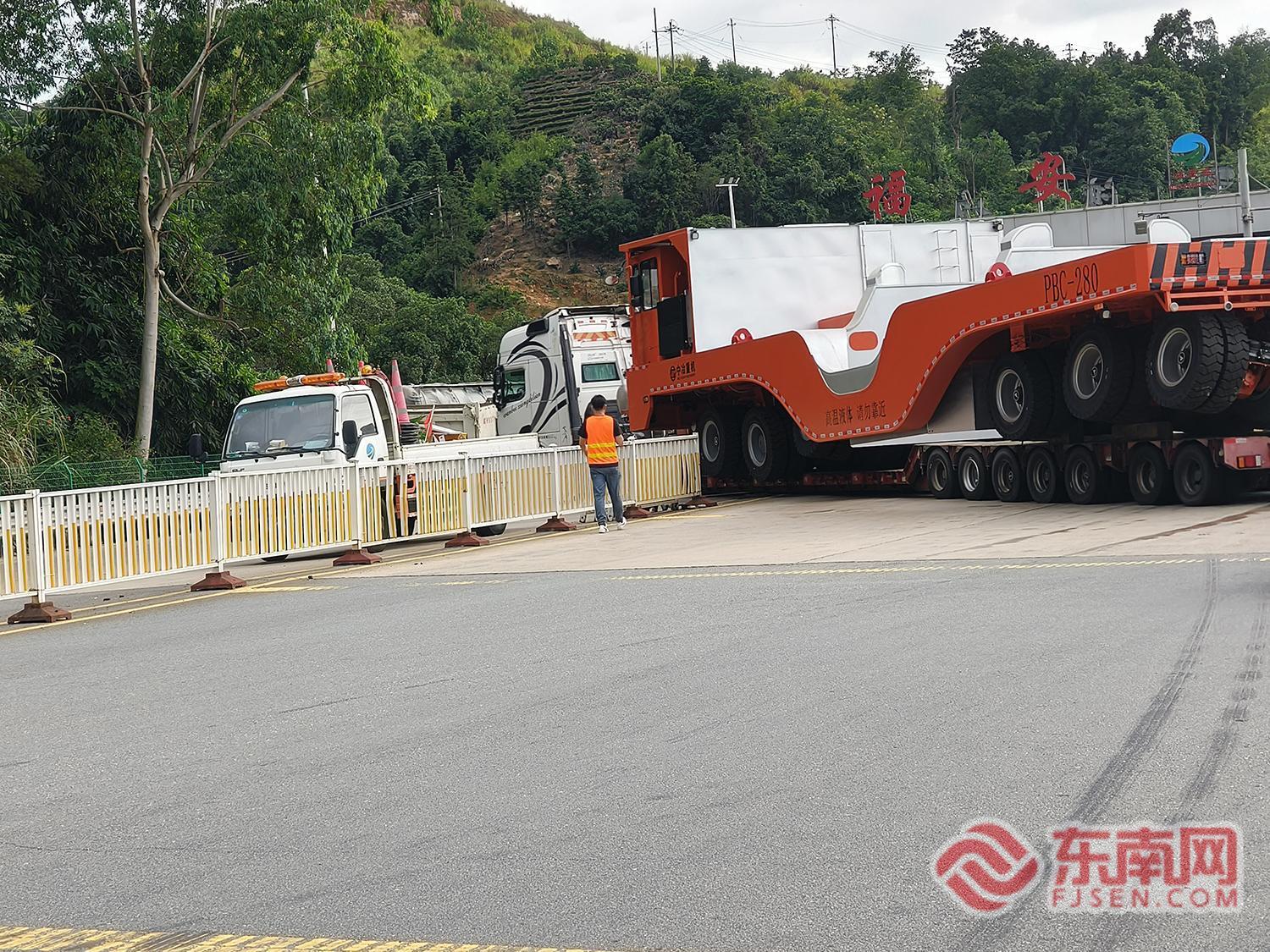 超限運(yùn)輸車輛通過灣塢收費(fèi)站。寧德高速執(zhí)法支隊(duì)供圖 為盡快打通通行通道,執(zhí)法人員立即與交警、高速養(yǎng)護(hù)等部門協(xié)商,制定應(yīng)急預(yù)案,最終決定引導(dǎo)車輛從入口車道反向駛出。隨后,各部門迅速進(jìn)入“作戰(zhàn)狀態(tài)”,按照分工高效協(xié)作,拆除中央隔離帶、入口邊道光柵及防撞水泥墩,臨時(shí)開辟出一條通行通道,并全程引導(dǎo)、協(xié)助司機(jī)操控車輛。經(jīng)過兩個(gè)多小時(shí)的高效配合,這輛超限運(yùn)輸車輛順利駛?cè)肴肟谑召M(fèi)站內(nèi)廣場(chǎng),并安全駛出灣塢收費(fèi)站。