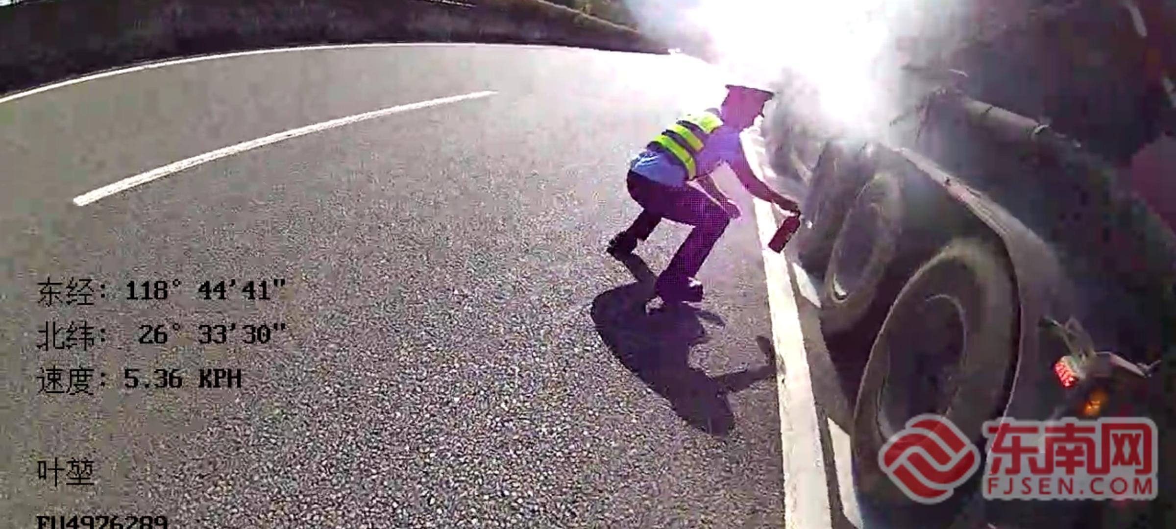 寧德高速執(zhí)法員對(duì)準(zhǔn)起火點(diǎn)滅火 滅火過(guò)程中,貨車輪胎因高溫發(fā)生爆炸,導(dǎo)致現(xiàn)場(chǎng)3名執(zhí)法人員出現(xiàn)耳鳴眩暈癥狀,其中一名人員手部被爆炸碎片劃傷。但執(zhí)法人員強(qiáng)忍身體不適,持續(xù)開(kāi)展處置工作,成功控制火情,并告知司機(jī)及時(shí)撥打“12122”救援電話,為后續(xù)處置爭(zhēng)取時(shí)間。