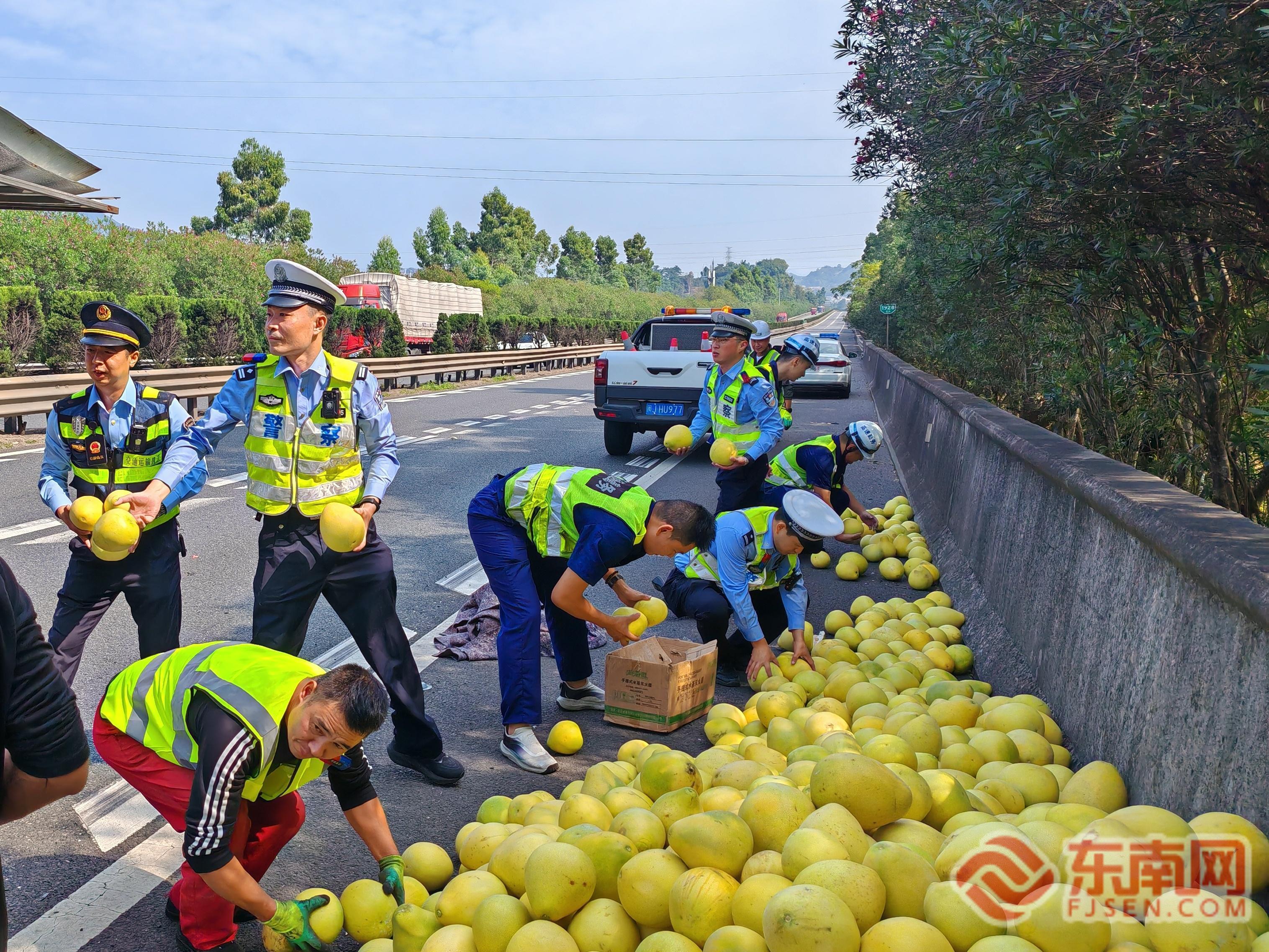 合力處置灑落柚子。寧德高速執(zhí)法支隊(duì)供圖 情況緊急,刻不容緩。執(zhí)法人員立即啟動(dòng)應(yīng)急預(yù)案,同步激活“5+N”協(xié)作機(jī)制。現(xiàn)場各方力量分工明確、協(xié)同高效:一組人員迅速負(fù)責(zé)現(xiàn)場安全布控,在事故后方規(guī)范設(shè)置警示區(qū)域,擺放反光錐筒,并指揮引導(dǎo)后方車輛有序通行;另一組人員則與聞?dòng)嵹s來的高速交警、路勤、養(yǎng)護(hù)等聯(lián)動(dòng)單位并肩協(xié)作,以應(yīng)急車道為主作業(yè)面,全力投入散落柚子的清理與轉(zhuǎn)運(yùn)工作。整個(gè)處置流程銜接緊密,各方配合默契,形成了高效的處置合力。