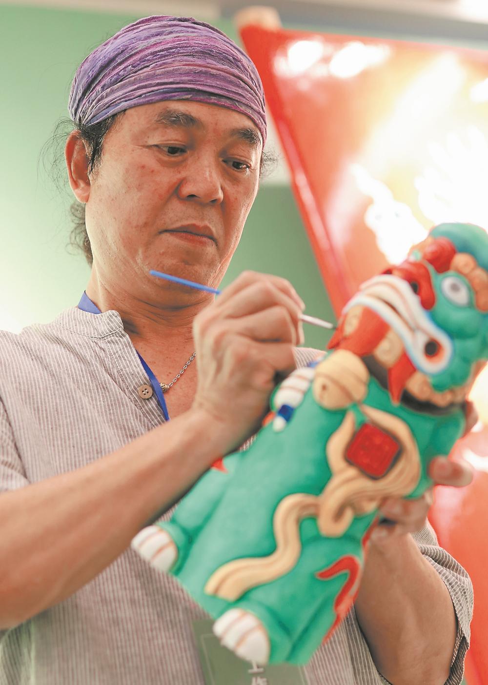 金門藝術(shù)家王明宗現(xiàn)場給風(fēng)獅爺上色。陳建和 攝