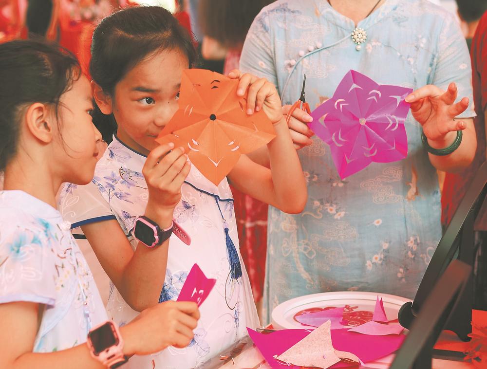 孩子們現(xiàn)場體驗(yàn)剪紙樂趣。陳建和 攝 |