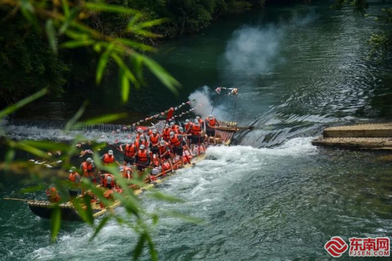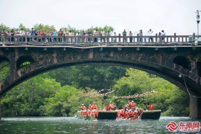 農(nóng)歷五月初五,武夷山九曲溪一年一度的“端午洗河”如期而至。張筱惜 攝 九曲溪是武夷山最具代表性的風(fēng)光,全長約10公里,面積8.5平方公里,每一曲都有不同景致的山水畫意,在過去也是當(dāng)?shù)厝酥匾暮竭\通道。端午節(jié)祭河神活動是武夷山獨特的傳統(tǒng)習(xí)俗之一,俗稱“洗河”“洗溪”。 端午節(jié)正午時分,位于星村的九曲溪竹筏碼頭熱鬧起來。當(dāng)?shù)靥厣闹穹覓焐喜势臁⒉蕩?,仿佛一艘斑斕的龍舟。由筏工組成的兩支隊伍乘著竹筏沿九曲溪順流而下,劃槳如翼,爭相競渡,途經(jīng)五曲大橋、玉女峰、武夷宮等地,抵達(dá)終點竹筏裝運碼頭。筏工們沿途向溪水中灑下茶梗、大米、熟芝麻、鹽等物品,消災(zāi)祛病,口中反復(fù)吟誦著吉祥的話語,祈禱一年風(fēng)調(diào)雨順,五谷豐登,祝福九曲溪上的筏工、當(dāng)?shù)孛癖姾蛷V大游客平安健康?;顒訒r,九曲溪兩岸旌旗獵獵,觀看儀式的市民和游客人頭攢動,風(fēng)中傳來的鑼鼓聲、吶喊聲響徹溪畔。