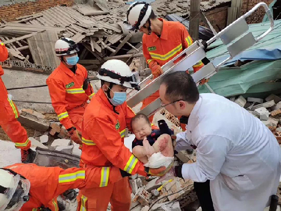 現(xiàn)場(chǎng)指揮部研究部署救援方案 現(xiàn)場(chǎng)指揮部迅速制定詳細(xì)救援方案,在確保被困人員安全前提下,堅(jiān)持“先易后難、由淺及里”的方針,集中力量在最有可能埋壓人員的區(qū)域打通多個(gè)小作業(yè)面,由搜救犬和生命探測(cè)儀對(duì)局部坍塌建筑實(shí)施搜索定位,確定被困人員位置后,破拆攻堅(jiān)組隨即跟進(jìn)實(shí)施救援。 6時(shí)35分,搜救組先后確認(rèn)3名被困人員位置,破拆作業(yè)迅速展開。 7時(shí)10分,福州支隊(duì)指戰(zhàn)員在坍塌建筑分別開辟出3處救援通道,2名被困人員先后成功獲救,均無生命危險(xiǎn)。 7時(shí)55分,現(xiàn)場(chǎng)一條搜救犬搜索定位出四名被困人員,其中1名男嬰、1名女童。 確定被困人員后,救援人員迅速跟進(jìn)展開救援。根據(jù)被困者周邊情況,指戰(zhàn)員首先利用起重氣墊,在倒塌樓板下支撐起近半米的救援作業(yè)空間,采取安全防護(hù)與快速清理救援相結(jié)合的方式,不斷加快救援進(jìn)度。 8時(shí)26分,1名男嬰和1名女童相繼被救出;隨著救援空間的不斷擴(kuò)大,又1名被困女性也隨即被救出;在她的指引下,指戰(zhàn)員又發(fā)現(xiàn)一名被困男性。