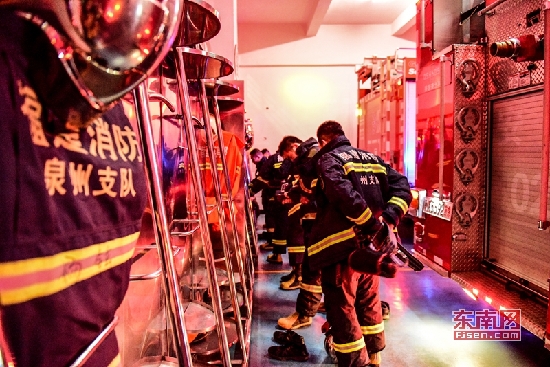 緊湊的警鈴聲響起,隊員們要在最短的時間內(nèi)穿好戰(zhàn)斗服出發(fā)。東南網(wǎng)記者 林婕 攝