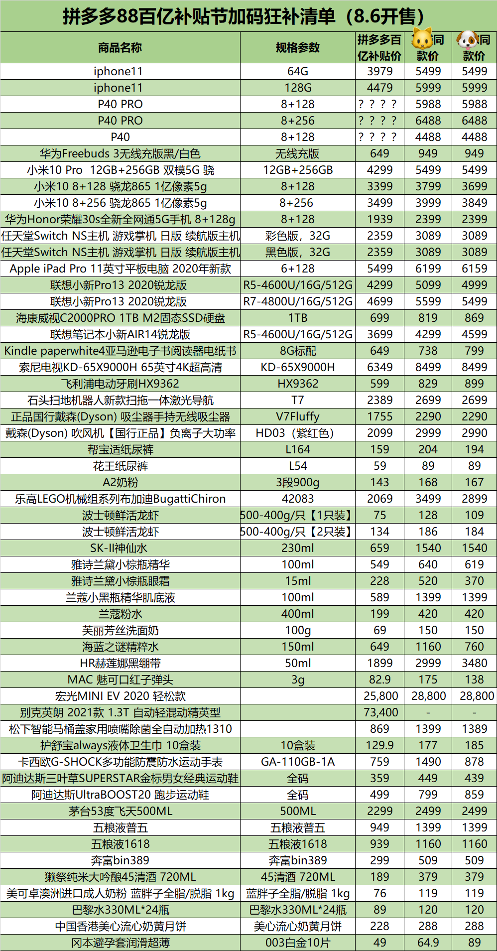 拼多多“百億補(bǔ)貼節(jié)”公布的部分價(jià)格清單顯示,平臺(tái)包括iPhone 11、任天堂Switch、SK-II神仙水、花王紙尿褲等在內(nèi)熱門商品售價(jià)均大幅低于其他渠道銷售價(jià)格。 8月5日,新電商平臺(tái)拼多多宣布,為進(jìn)一步滿足消費(fèi)者對(duì)高品質(zhì)產(chǎn)品與服務(wù)的需求,持續(xù)釋放內(nèi)需市場(chǎng)的潛力,助力形成以國(guó)內(nèi)大循環(huán)為主體的新發(fā)展格局,平臺(tái)將再次提高商品銷售的補(bǔ)貼力度,在8月6日正式上線“百億補(bǔ)貼節(jié)”活動(dòng)。屆時(shí),眾多大牌商品將以前所未有的優(yōu)惠價(jià)格直接呈現(xiàn)在消費(fèi)者面前。 據(jù)介紹,拼多多“百億補(bǔ)貼節(jié)”將從8月6日開(kāi)始,持續(xù)至8月8日。在為期三天的活動(dòng)中,平臺(tái)將加大對(duì)包括Apple蘋(píng)果、Dyson戴森、Sony索尼、華為、雅詩(shī)蘭黛、蘭蔻、Mac魅可、花王、五糧液等在內(nèi)的近期國(guó)內(nèi)外熱銷品牌的補(bǔ)貼力度,覆蓋家電數(shù)碼、美妝個(gè)護(hù)、母嬰親子、食品飲料、服裝箱包等近20個(gè)品類的上萬(wàn)款商品。 “此次活動(dòng),是我們貫徹讓消費(fèi)者‘每天都是618,每晚都過(guò)雙11’理念的又一舉措?!逼炊喽唷鞍賰|補(bǔ)貼”負(fù)責(zé)人宗輝說(shuō)。此前,拼多多曾在傳統(tǒng)節(jié)日和銷售旺季之外,先后推出過(guò)“秒殺節(jié)”“真香節(jié)”“清涼節(jié)”等補(bǔ)貼讓利活動(dòng),得到了大量消費(fèi)者、品牌方和經(jīng)銷商的支持和肯定。 宗輝表示,活動(dòng)期間,在平臺(tái)的大力補(bǔ)貼下,不少大牌商品的價(jià)格將迎來(lái)“歷史新低”?!癷Phone 11 64G版將直接降至3979元,首次來(lái)到4000元以下區(qū)間;飛利浦電動(dòng)牙刷HX9362僅售599元,不到600元即可拿下HX9系高端產(chǎn)品;230mL裝的SK-II神仙水到手價(jià)僅為659元,均達(dá)到全渠道歷史最低價(jià)。” 此外,對(duì)于消費(fèi)者呼聲最高的汽車類商品,拼多多也進(jìn)行了積極響應(yīng)。在平臺(tái)公布的部分商品價(jià)格清單上,五菱宏光 MINI EV 2020輕松款補(bǔ)貼價(jià)為25800元,比官方指導(dǎo)價(jià)28800元優(yōu)惠3000元,別克英朗2021款 1.3T 自動(dòng)輕混動(dòng)精英型轎車僅售73400元,比官方指導(dǎo)價(jià)125900元優(yōu)惠40%以上。 “不少網(wǎng)友都把‘人民需要什么,拼多多就補(bǔ)貼什么’當(dāng)作玩笑和段子,但我們是認(rèn)真的?!弊谳x表示,“拼多多將始終堅(jiān)持以消費(fèi)者為核心,不斷提高商品補(bǔ)貼范圍和力度,提升服務(wù)質(zhì)量,讓消費(fèi)者每天都能花得更少、買得更好。” |
