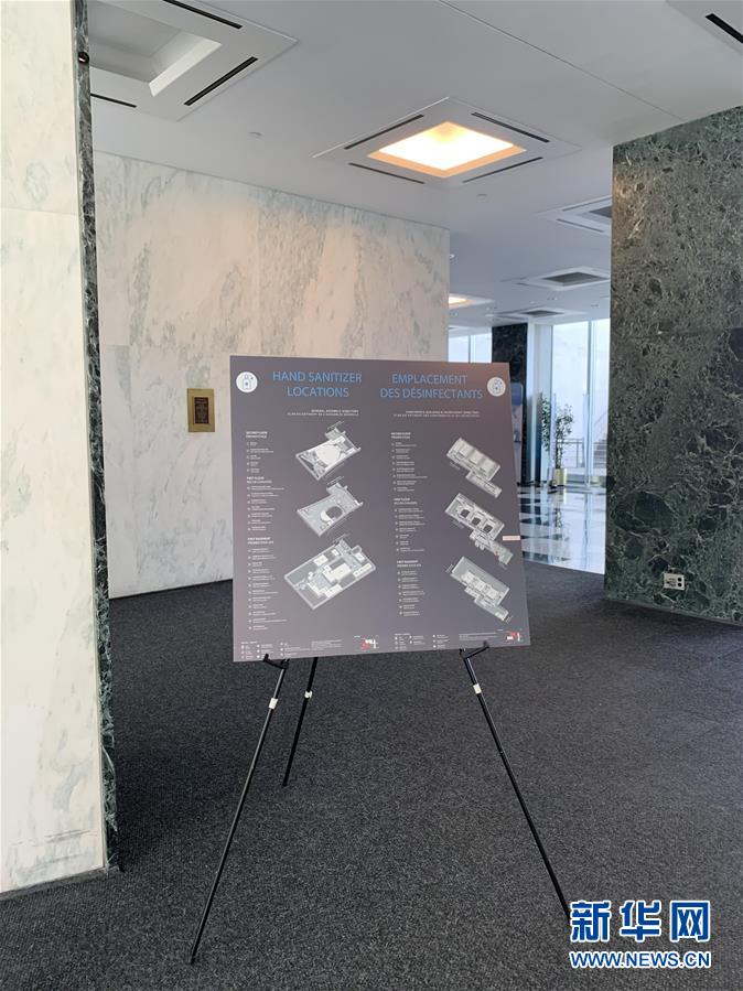 7月20日,在位于紐約的聯(lián)合國(guó)總部,秘書(shū)處大樓入口附近豎立著一塊標(biāo)明消毒液擺放點(diǎn)的指示牌。 新華社記者 王建剛 攝