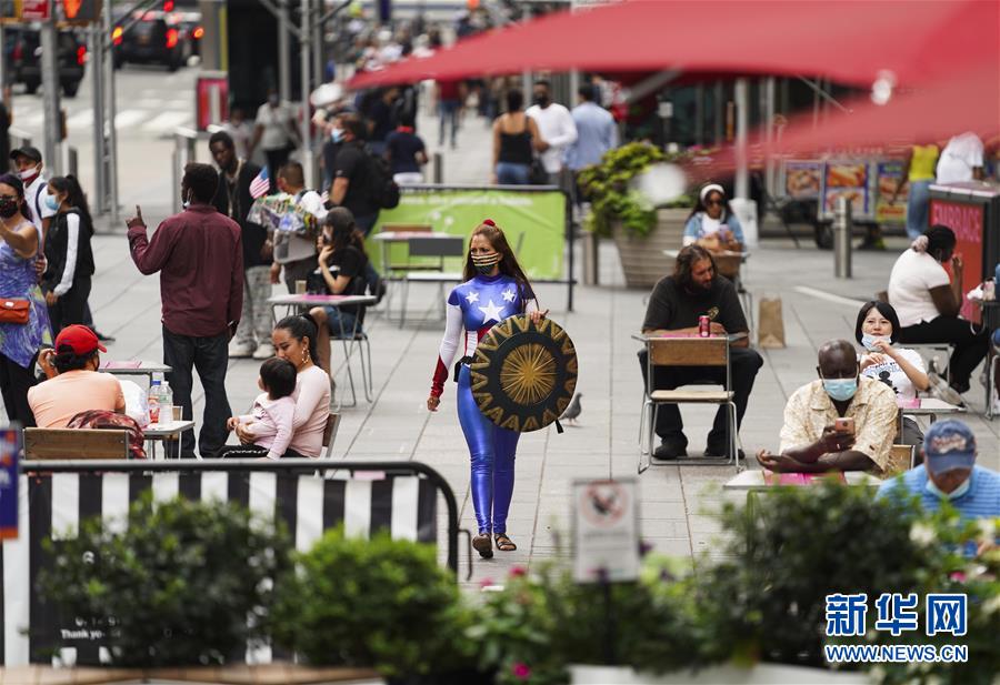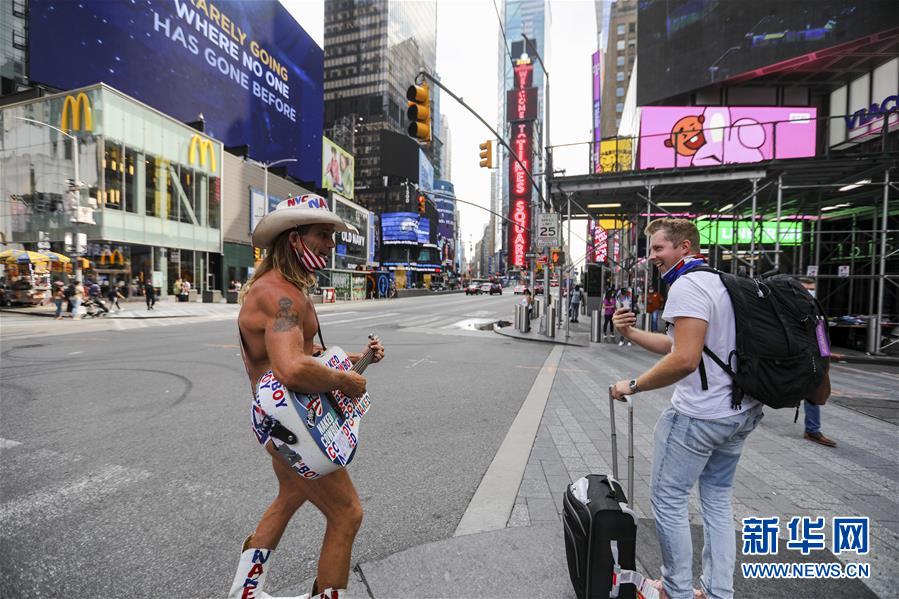 8月19日,一名街頭表演者在美國紐約時報廣場招攬顧客。 新華社記者 王迎 攝