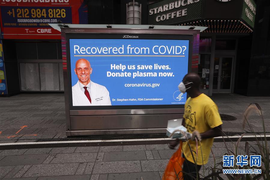 8月19日,在美國紐約,一名行人從號召新冠康復者捐獻血漿的廣告牌旁走過。 新華社記者 王迎 攝