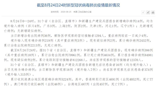 人民網(wǎng)北京8月25日電(董童)國家衛(wèi)生健康委于今日在官網(wǎng)發(fā)布的《截至8月24日24時新型冠狀病毒肺炎疫情最新情況》(以下簡稱“情況”)提出,8月24日0—24時,31個?。ㄗ灾螀^(qū)、直轄市)和新疆生產(chǎn)建設(shè)兵團報告新增確診病例14例,均為境外輸入病例(四川4例,廣東3例,上海2例,陜西2例,天津1例,河北1例,遼寧1例);無新增死亡病例;無新增疑似病例。當(dāng)日新增治愈出院病例36例,解除醫(yī)學(xué)觀察的密切接觸者1294人,重癥病例較前一日減少4例。