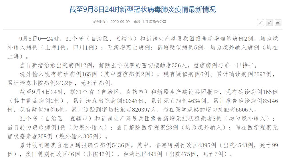 人民網(wǎng)北京9月9日電(董童)國家衛(wèi)生健康委于今日在官網(wǎng)發(fā)布的《截至9月8日24時新型冠狀病毒肺炎疫情最新情況》(以下簡稱“情況”)提出,9月8日0—24時,31個?。ㄗ灾螀^(qū)、直轄市)和新疆生產(chǎn)建設(shè)兵團報告新增確診病例2例,均為境外輸入病例(上海1例,四川1例);無新增死亡病例;新增疑似病例5例,均為境外輸入病例(均在上海)。當日新增治愈出院病例12例,解除醫(yī)學觀察的密切接觸者336人,重癥病例與前一日持平。
