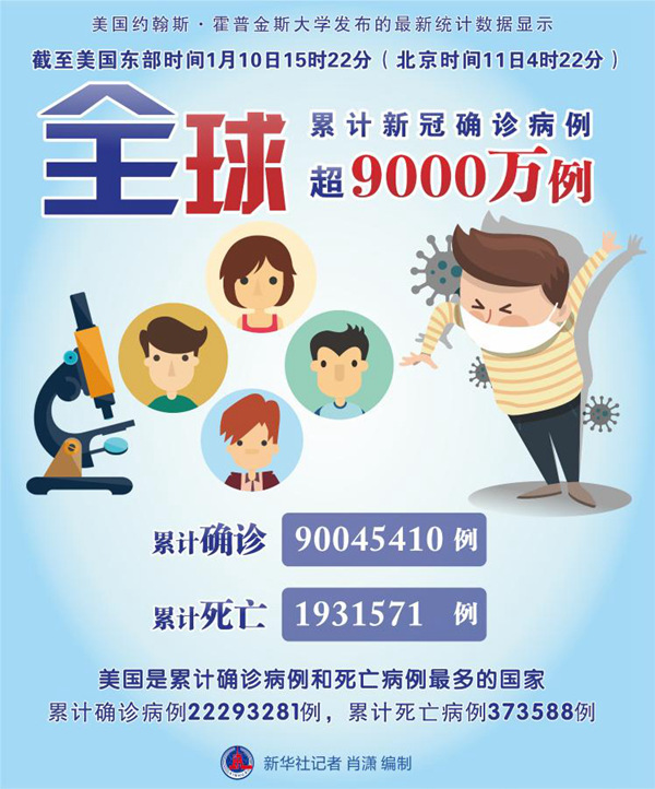 圖表:約翰斯·霍普金斯大學(xué):全球累計(jì)新冠確診病例超9000萬例 新華社記者 肖瀟 編制 新華社紐約1月10日電 美國約翰斯·霍普金斯大學(xué)10日發(fā)布的新冠疫情最新統(tǒng)計(jì)數(shù)據(jù)顯示,截至美國東部時間10日15時22分(北京時間11日4時22分),全球累計(jì)新冠確診病例超過9000萬例,達(dá)90045410例,累計(jì)死亡病例1931571例。 數(shù)據(jù)顯示,美國是累計(jì)確診病例和死亡病例最多的國家,累計(jì)確診病例22293281例,累計(jì)死亡病例373588例。累計(jì)確診病例較多的國家還有印度、巴西、俄羅斯、英國和法國等,累計(jì)死亡病例較多的國家還有巴西、印度、墨西哥、英國和意大利等。 這些數(shù)據(jù)來自約翰斯·霍普金斯大學(xué)新冠病毒研究項(xiàng)目實(shí)時匯總的各個國家和地區(qū)的數(shù)據(jù)。 |