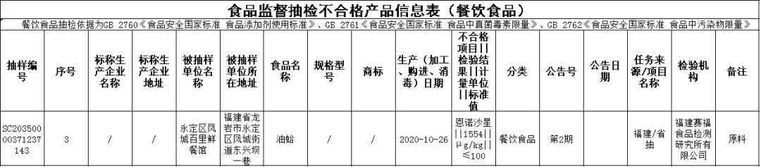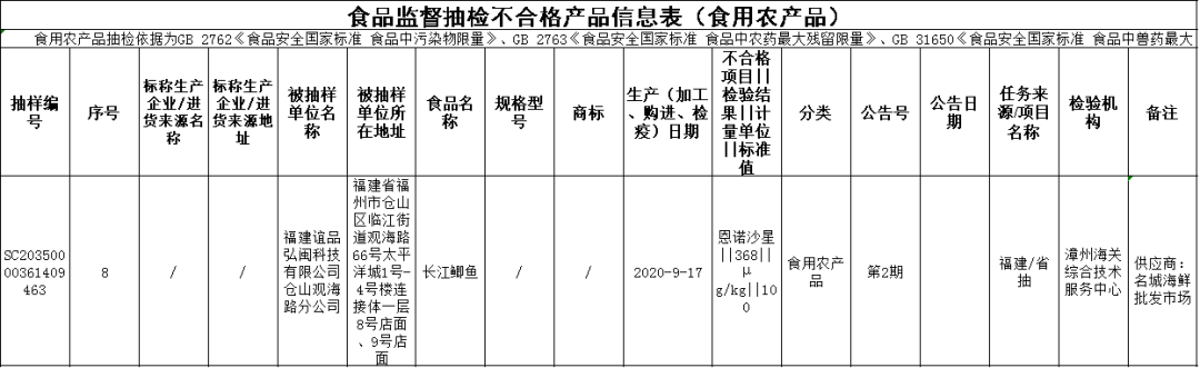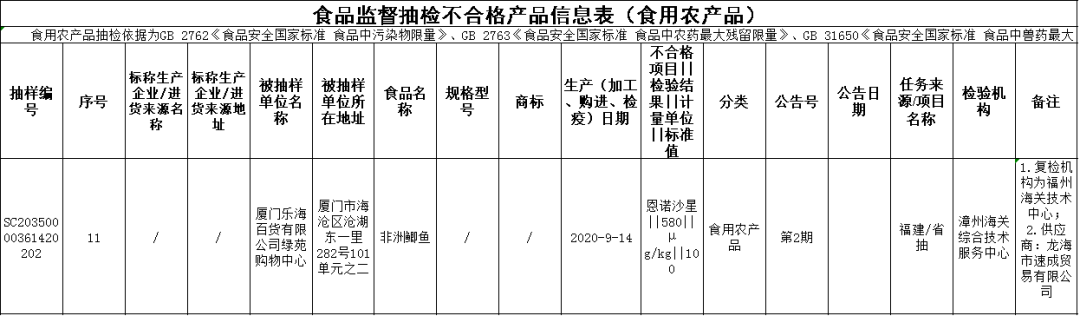 農(nóng)獸藥殘留問題 ◆永定區(qū)鳳城百里鮮餐館銷售的油蛤(購進日期為2020年10月26日),恩諾沙星不合格,檢驗機構(gòu)為福建賽福食品檢測研究所有限公司; ◆泉州新華都購物廣場有限公司晉江磁灶店銷售的草鱺魚(購進日期為2020年8月11日),呋喃唑酮代謝物不合格、氧氟沙星不合格,初檢機構(gòu)為漳州海關(guān)綜合技術(shù)服務(wù)中心,復(fù)檢機構(gòu)為廈門海關(guān)技術(shù)中心; ◆中閩百匯(中國)零售集團有限公司晉江橋南分公司銷售的冰鮮海鱸魚(購進日期為2020年8月8日),恩諾沙星不合格,初檢機構(gòu)為漳州海關(guān)綜合技術(shù)服務(wù)中心,復(fù)檢機構(gòu)為福州海關(guān)技術(shù)中心; ◆漳州新華都百貨有限責(zé)任公司元光店銷售的土雞蛋(購進日期為2020年8月17日),氟苯尼考不合格,初檢機構(gòu)為廈門海關(guān)技術(shù)中心,復(fù)檢機構(gòu)為福建省產(chǎn)品質(zhì)量檢驗研究院; ◆泉州市洛江區(qū)萬安??吐〕袖N售的上海青(購進日期為2020年8月24日),毒死蜱不合格,初檢機構(gòu)為廈門海關(guān)技術(shù)中心,復(fù)檢機構(gòu)為福建中檢華日食品安全檢測有限公司; ◆漳州新華都百貨有限責(zé)任公司丹霞店銷售的油蛤(購進日期為2020年8月25日),恩諾沙星不合格,初檢機構(gòu)為漳州海關(guān)綜合技術(shù)服務(wù)中心,復(fù)檢機構(gòu)為福建中檢華日食品安全檢測有限公司; ◆福建永輝超市有限公司莆田市水韻城店銷售的草鱺(購進日期為2020年8月26日),氧氟沙星不合格,初檢機構(gòu)為漳州海關(guān)綜合技術(shù)服務(wù)中心,復(fù)檢機構(gòu)為福州海關(guān)技術(shù)中心; ◆福建誼品弘閩科技有限公司倉山觀海路分公司銷售的長江鯽魚(購進日期為2020年9月17日),恩諾沙星不合格,檢驗機構(gòu)為漳州海關(guān)綜合技術(shù)服務(wù)中心; ◆福建永輝超市有限公司莆田市荔城區(qū)黃石鎮(zhèn)晴嵐店銷售的草鱺(購進日期為2020年8月27日),氧氟沙星不合格,初檢機構(gòu)為漳州海關(guān)綜合技術(shù)服務(wù)中心,復(fù)檢機構(gòu)為福建省產(chǎn)品質(zhì)量檢驗研究院; ◆羅源縣金源瑞都超市有限公司銷售的多寶魚(購進日期為2020年9月12日),恩諾沙星不合格、氧氟沙星不合格,檢驗機構(gòu)為漳州海關(guān)綜合技術(shù)服務(wù)中心; ◆廈門樂海百貨有限公司綠苑購物中心銷售的非洲鯽魚(購進日期為2020年9月14日),恩諾沙星不合格,初檢機構(gòu)為漳州海關(guān)綜合技術(shù)服務(wù)中心,復(fù)檢機構(gòu)為福州海關(guān)技術(shù)中心; ◆泉州新華都購物廣場有限公司湖心店銷售的雞腿(購進日期為2020年8月26日),呋喃西林代謝物(SEM)不合格,初檢機構(gòu)為廣州廣電計量檢測股份有限公司,復(fù)檢機構(gòu)為福建省產(chǎn)品質(zhì)量檢驗研究院; ◆福建冠業(yè)投資發(fā)展有限公司漳平圣宇廣場店銷售的龍膽魚(購進日期為2020年10月21日),呋喃唑酮代謝物不合格,檢驗機構(gòu)為漳州海關(guān)綜合技術(shù)服務(wù)中心; ◆長泰縣寶國海產(chǎn)品攤銷售的鱸魚(購進日期為2020年10月28日),氯霉素不合格,檢驗機構(gòu)為漳州海關(guān)綜合技術(shù)服務(wù)中心; ◆新羅區(qū)阿妹海產(chǎn)品攤銷售的明蝦(購進日期為2020年10月28日),呋喃唑酮代謝物不合格,檢驗機構(gòu)為漳州海關(guān)綜合技術(shù)服務(wù)中心; ◆沙縣農(nóng)興海鮮超市銷售的龍膽魚(購進日期為2020年10月28日),呋喃唑酮代謝物不合格,檢驗機構(gòu)為漳州海關(guān)綜合技術(shù)服務(wù)中心。