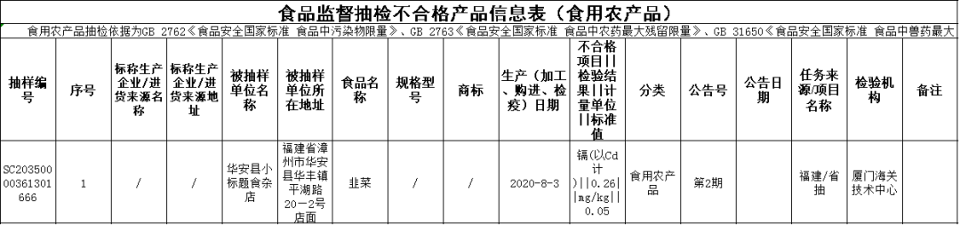 重金屬污染問題 ◆華安縣小標(biāo)題食雜店銷售的韭菜(購進日期為2020年8月3日),鎘(以Cd計)不合格,檢驗機構(gòu)為廈門海關(guān)技術(shù)中心;