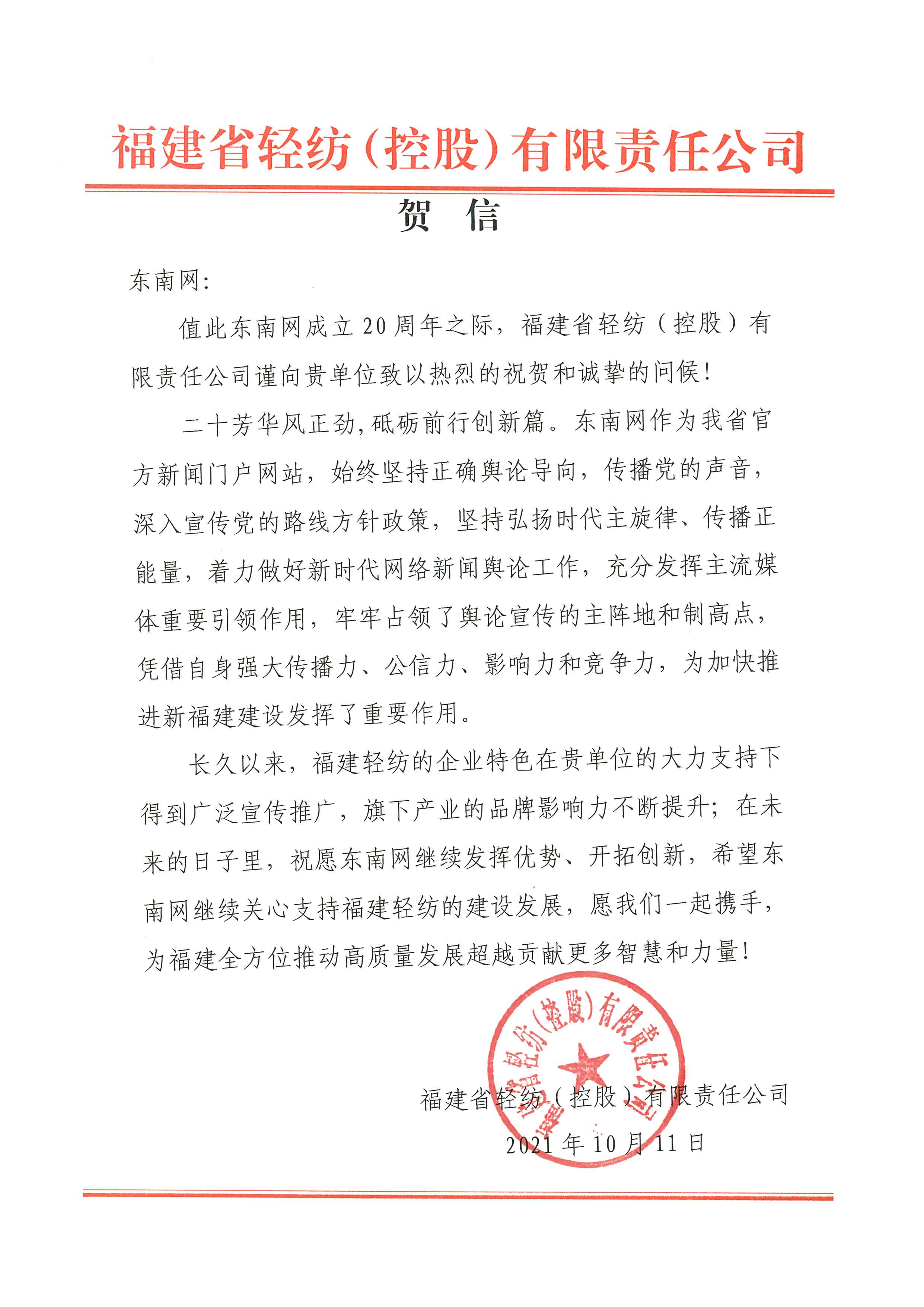 福建省輕紡(控股)有限責(zé)任公司賀信