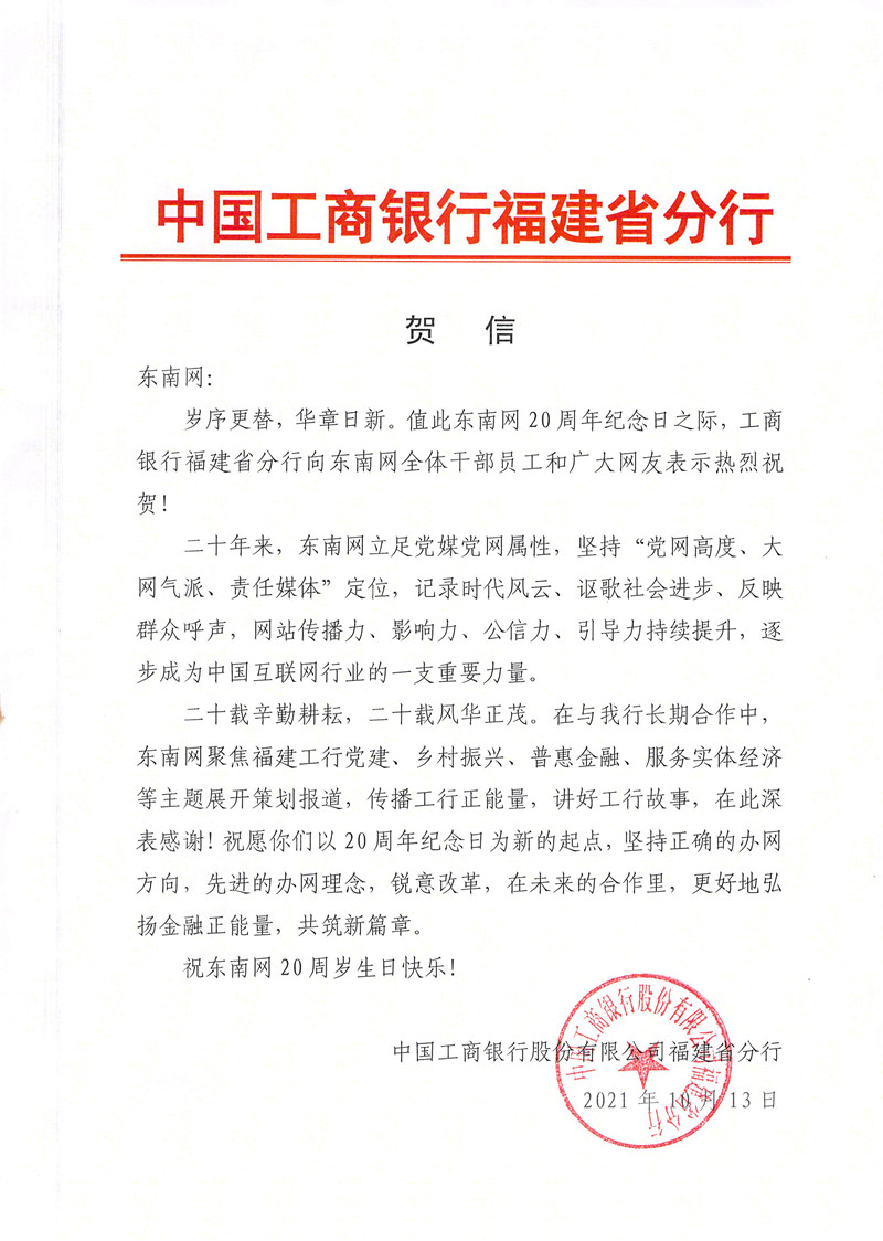 中國工商銀行福建省分行賀信