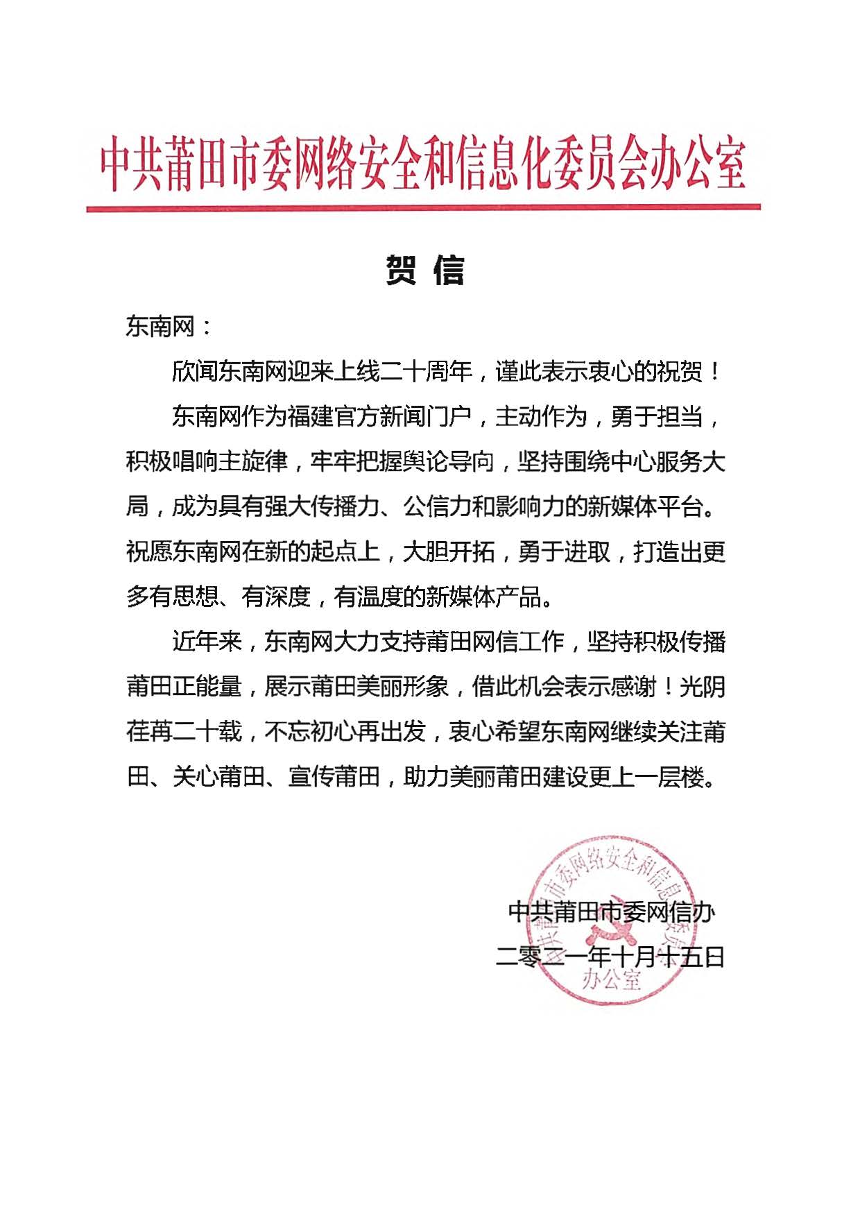 中共莆田市委網(wǎng)絡(luò)安全和信息化委員會辦公室賀信