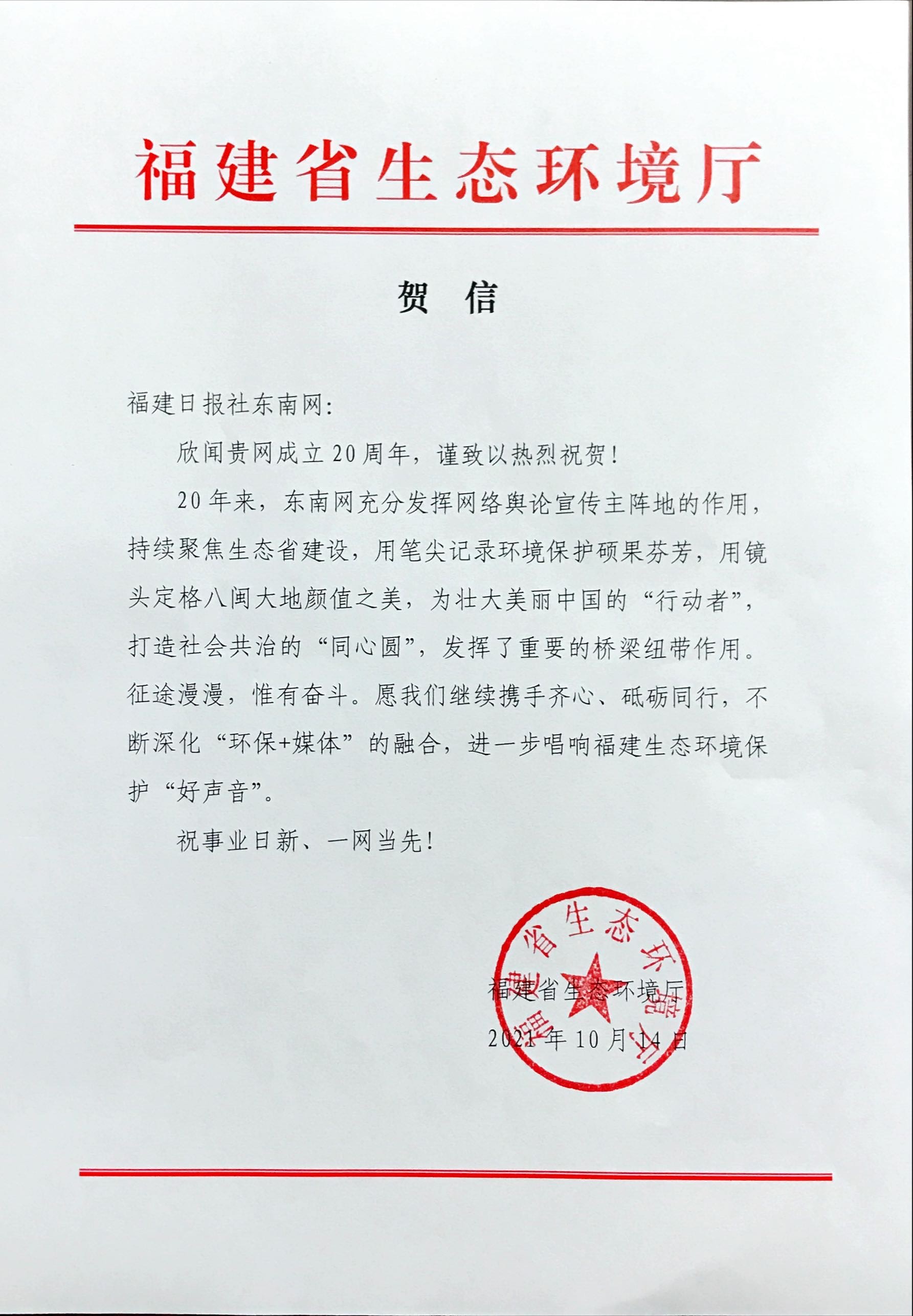 福建省生態(tài)環(huán)境廳賀信