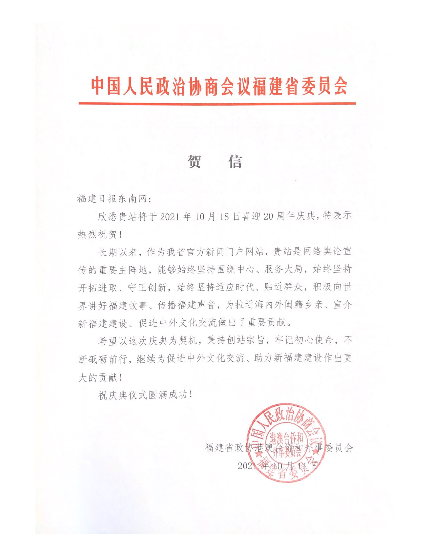 福建省政協(xié)港澳臺(tái)僑和外事委員會(huì)賀信