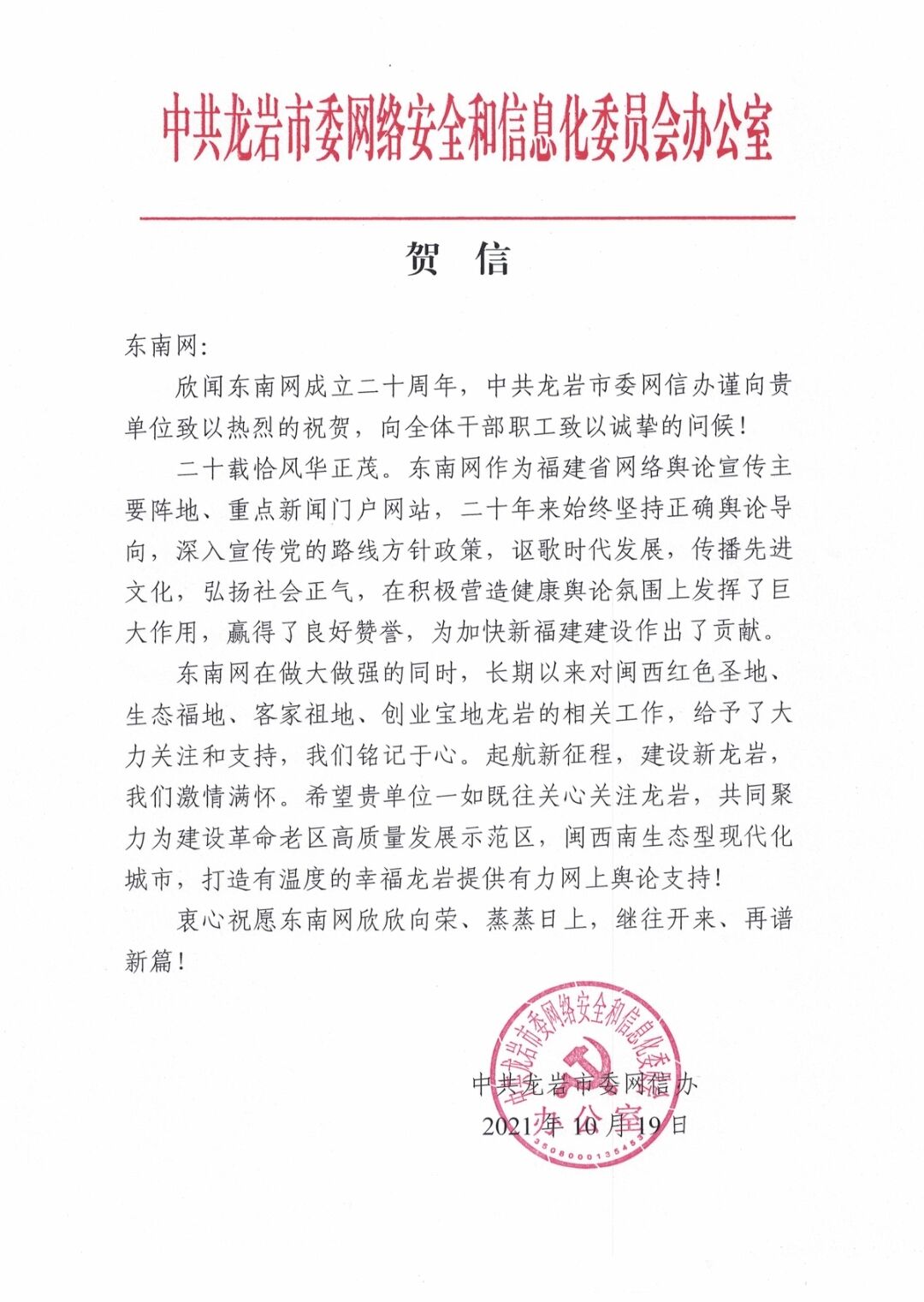 中共龍巖市委網(wǎng)絡(luò)安全和信息化委員會(huì)辦公室賀信
