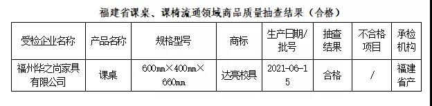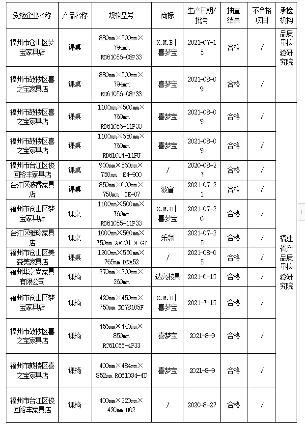 課桌椅的安全性一直是學校家長社會關(guān)注的重點,由于學生每天直接接觸使用其安全性必須得到充分的保證。有的課桌椅存在危險銳利尖銳物安全隱患,有的課桌椅產(chǎn)品低價甲醛釋放量超標,導致學生頭暈、頭痛等,很容易給孩子們帶來傷害。 根據(jù)市場監(jiān)管總局關(guān)于開展消費品質(zhì)量安全進校園活動的要求,近期,福建省市場監(jiān)管局依據(jù)《產(chǎn)品質(zhì)量法》,組織對學生課桌椅產(chǎn)品質(zhì)量開展省級監(jiān)督抽查。共抽查7家銷售單位的課桌10批次產(chǎn)品、7家銷售單位的課椅10批次產(chǎn)品。 本次抽查依據(jù)QB/T 4071-2010 《課桌椅》標準的要求,對課桌的安全性、桌面垂直靜載荷、桌面垂直耐久性、桌面垂直沖擊、桌腿跌落、桌面水平靜載荷、重金屬含量(限色漆)、甲醛釋放量等8個項目進行了檢驗;對課椅的安全性、椅子向前傾翻、椅子側(cè)向傾翻(有扶手和無扶手)、椅子向后傾翻、凳子任意方向傾翻、座面椅背聯(lián)合靜載荷、座面?zhèn)认蜢o載荷、椅腿向前靜載荷、椅腿側(cè)向靜載荷、座面沖擊、椅背沖擊、踏腳靜載荷、椅腿跌落、枕靠側(cè)向靜載荷、扶手側(cè)向靜載荷、重金屬含量(限色漆)、甲醛釋放量等17個項目進行了檢驗,未發(fā)現(xiàn)不合格產(chǎn)品。 合格產(chǎn)品信息表