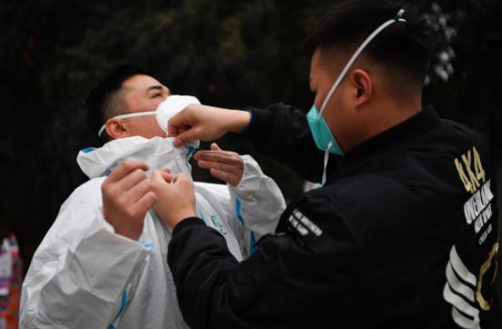 1月7日,西安市雁塔區(qū)退役軍人志愿突擊隊(duì)隊(duì)員李龍(右)協(xié)助隊(duì)員吉存勝穿上防護(hù)服。 西安市本輪疫情發(fā)生以來,在防控壓力較大的西安市雁塔區(qū),有支退役軍人志愿突擊隊(duì)活躍在疫情防控一線。 曾戍守邊疆多年的戰(zhàn)士、曾縱橫藍(lán)天的女空降兵、剛退役的大學(xué)生士兵……在西安市雁塔區(qū)退役軍人事務(wù)局發(fā)出招募信息后,許多退役軍人第一時間響應(yīng),加入疫情防控戰(zhàn)。 近半個月的時間里,已有超過600名退役軍人報名參加志愿突擊隊(duì),承擔(dān)轉(zhuǎn)運(yùn)抗疫物資、運(yùn)送核酸檢測樣本、協(xié)助社區(qū)管理等工作。 新華社記者 張博文 攝影報道 |