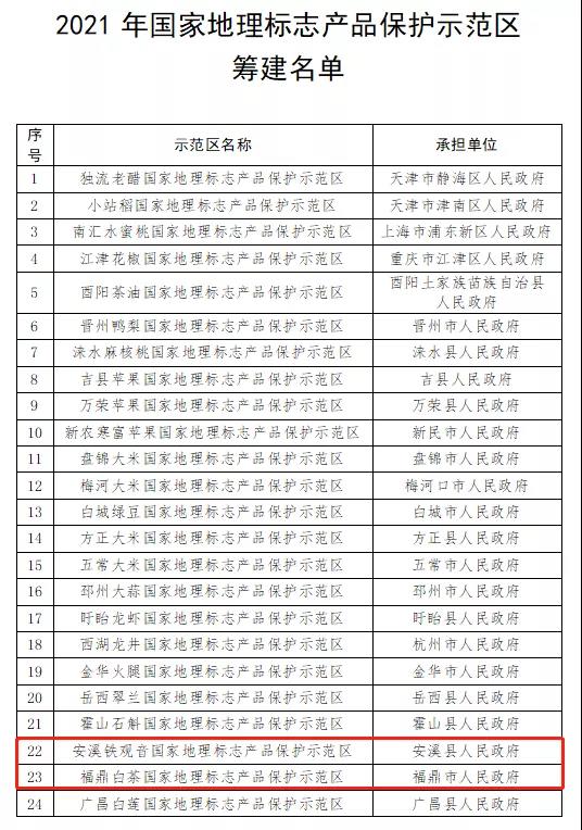 2021年國家地理標(biāo)志產(chǎn)品保護(hù)示范區(qū)籌建名單公布!福建兩個地方上榜!