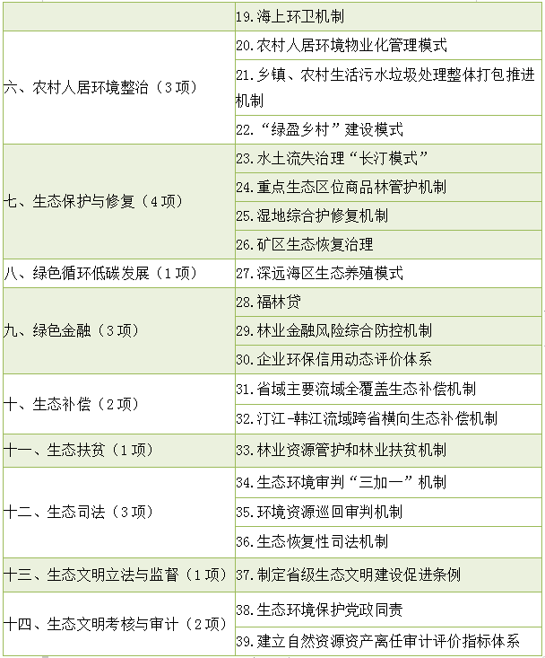 經(jīng)國務(wù)院同意,國家發(fā)展改革委近日正式印發(fā)《國家生態(tài)文明試驗區(qū)改革舉措和經(jīng)驗做法推廣清單》,充分肯定了福建等四個國家生態(tài)文明試驗區(qū) 大膽探索、先行先試,并向全國推廣自然資源資產(chǎn)產(chǎn)權(quán)、國土空間開發(fā)保護、環(huán)境治理體系、水資源水環(huán)境綜合整治等14個領(lǐng)域形成的90項改革舉措和經(jīng)驗做法。其中,福建39項改革舉措和經(jīng)驗做法入選,居四省推廣總數(shù)首位。 2016年8月,中共中央辦公廳、國務(wù)院辦公廳印發(fā)了《國家生態(tài)文明試驗區(qū)(福建)實施方案》,福建成為全國首個國家生態(tài)文明試驗區(qū)。在習(xí)近平生態(tài)文明思想的重要指引下,全省干部群眾持之以恒深入實施生態(tài)省建設(shè)戰(zhàn)略,統(tǒng)籌推進國家生態(tài)文明試驗區(qū)建設(shè),聚焦于生態(tài)文明體制改革綜合試驗,健全改革推進機制,抓好制度創(chuàng)新、生態(tài)保護、綠色發(fā)展等各項工作,以點帶面實現(xiàn)“先試點后推廣”的改革路徑,探索創(chuàng)新了一批可復(fù)制、可推廣的制度模式,為生態(tài)環(huán)境質(zhì)量總體改善保駕護航,全省生態(tài)文明領(lǐng)域治理體系和治理能力現(xiàn)代化進程穩(wěn)步推進。 經(jīng)過持續(xù)努力,福建在實現(xiàn)生態(tài)環(huán)境“高顏值”和經(jīng)濟發(fā)展“高素質(zhì)”的道路上邁出堅實步伐。2020年前三季度—— 全省12條主要河流Ⅰ~Ⅲ類水質(zhì)比例為97.9%,高于全國平均水平16.7個百分點,縣級以上飲用水水源地水質(zhì)達標(biāo)率100%; 設(shè)區(qū)城市空氣達標(biāo)天數(shù)比例98.5%,高于全國平均水平11.3個百分點,PM2.5年平均濃度20微克/立方米,比全國平均水平低33.3%; 森林覆蓋率66.8%,連續(xù)41年保持全國首位,與此同時,我們積極抗疫情、穩(wěn)經(jīng)濟、謀發(fā)展,扎實做好“六穩(wěn)”工作,全面落實“六?!比蝿?wù),經(jīng)濟運行呈現(xiàn)持續(xù)明顯向上向好的態(tài)勢,前三季度GDP增長2.4%。 福建成為全國唯一一個保持水、大氣、生態(tài)環(huán)境全優(yōu)的省份和全國唯一的全省所有地級市人均GDP均超過全國平均水平的省份,中國工程院2019年發(fā)布的全國生態(tài)文明指數(shù),福建排名第一。 下階段,福建將圍繞中央關(guān)于生態(tài)文明建設(shè)的新部署新要求,以更高質(zhì)量深化國家生態(tài)文明試驗區(qū)建設(shè),以推進生態(tài)文明領(lǐng)域治理體系和治理能力現(xiàn)代化為目標(biāo),推動制度優(yōu)勢轉(zhuǎn)化為治理效能,促進經(jīng)濟社會發(fā)展全面綠色轉(zhuǎn)型,建設(shè)人與自然和諧共生的現(xiàn)代化,為建設(shè)美麗中國作出福建應(yīng)有的貢獻。 福建國家生態(tài)文明試驗區(qū)改革舉措和經(jīng)驗做法推廣清單
