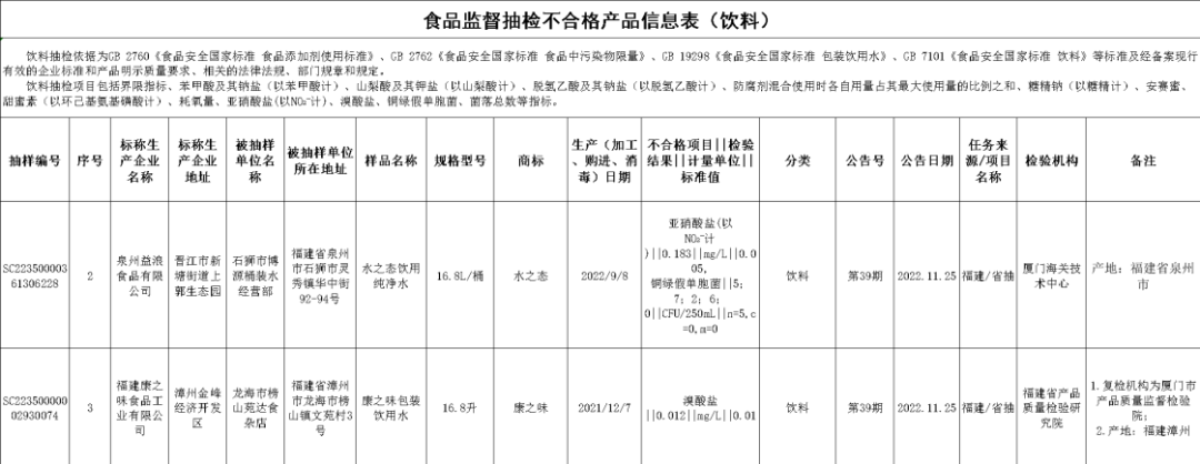 其他污染問題 南安市英都千百味快餐店的盤子(消毒日期為2022年9月22日),陰離子合成洗滌劑(以十二烷基苯磺酸鈉計)不合格,檢驗機構為福建省產(chǎn)品質(zhì)量檢驗研究院; 南安市英都千百味快餐店的湯碗(消毒日期為2022年9月22日),陰離子合成洗滌劑(以十二烷基苯磺酸鈉計)不合格、大腸菌群不合格,檢驗機構為福建省產(chǎn)品質(zhì)量檢驗研究院; 廈門市同安區(qū)林民珠小吃店的扁食碗(消毒日期為2022年9月22日),陰離子合成洗滌劑(以十二烷基苯磺酸鈉計)不合格,檢驗機構為福建省產(chǎn)品質(zhì)量檢驗研究院; 上杭縣瑞仟香飯店的碗(消毒日期為2022年9月24日),陰離子合成洗滌劑(以十二烷基苯磺酸鈉計)不合格、大腸菌群不合格,檢驗機構為福建省產(chǎn)品質(zhì)量檢驗研究院; 龍巖市好運通餐飲有限公司的碗(消毒日期為2022年9月26日),陰離子合成洗滌劑(以十二烷基苯磺酸鈉計)不合格,檢驗機構為福建省產(chǎn)品質(zhì)量檢驗研究院; 龍巖市好運通餐飲有限公司的杯子(消毒日期為2022年9月26日),陰離子合成洗滌劑(以十二烷基苯磺酸鈉計)不合格,檢驗機構為福建省產(chǎn)品質(zhì)量檢驗研究院; 廈門市味友閩南宴文化推廣有限公司的小圓碗(消毒日期為2022年9月23日),陰離子合成洗滌劑(以十二烷基苯磺酸鈉計)不合格、大腸菌群不合格,檢驗機構為福建省產(chǎn)品質(zhì)量檢驗研究院; 廈門市湖里區(qū)魚你相伴餐飲店的白方盤(消毒日期為2022年9月26日),陰離子合成洗滌劑(以十二烷基苯磺酸鈉計)不合格、大腸菌群不合格,檢驗機構為福建省產(chǎn)品質(zhì)量檢驗研究院; 福州高新區(qū)南嶼倪珊小吃店的瓷碗(消毒日期為2022年10月11日),陰離子合成洗滌劑(以十二烷基苯磺酸鈉計)不合格,檢驗機構為福建省產(chǎn)品質(zhì)量檢驗研究院; 福州高新區(qū)南嶼倪珊小吃店的圓盤(消毒日期為2022年10月11日),陰離子合成洗滌劑(以十二烷基苯磺酸鈉計)不合格,檢驗機構為福建省產(chǎn)品質(zhì)量檢驗研究院; 福州紅椒香餐飲管理有限公司的筷子(消毒日期為2022年10月17日),陰離子合成洗滌劑(以十二烷基苯磺酸鈉計)不合格,檢驗機構為福建省產(chǎn)品質(zhì)量檢驗研究院; 泉州益浪食品有限公司2022年9月8日生產(chǎn)的水之態(tài)飲用純凈水,亞硝酸鹽(以NO2ˉ計)不合格、銅綠假單胞菌不合格,銷售單位為石獅市博源桶裝水經(jīng)營部,檢驗機構為廈門海關技術中心; 福建康之味食品工業(yè)有限公司2021年12月7日生產(chǎn)的康之味包裝飲用水,溴酸鹽不合格,銷售單位為龍海市榜山苑達食雜店,初檢機構為福建省產(chǎn)品質(zhì)量檢驗研究院,復檢機構為廈門市產(chǎn)品質(zhì)量監(jiān)督檢驗院。