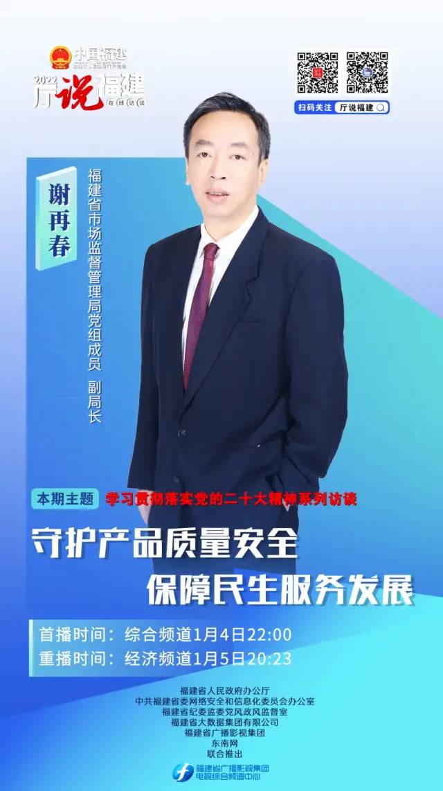 由福建省人民政府辦公廳、省委網信辦、省紀委監(jiān)委黨風政風監(jiān)督室主辦,省大數(shù)據(jù)集團有限公司、省廣播影視集團、東南網承辦的全媒體政務訪談類節(jié)目《中國福建·在線訪談—廳說福建2022》將于1月4日22:00在綜合頻道首播,1月5日20:23在經濟頻道重播。 本期節(jié)目邀請福建省市場監(jiān)督管理局黨組成員、副局長謝再春做客演播廳,與參與“云連線”來自廈門市市場監(jiān)督管理局、省產品質量檢驗研究院、省纖維檢驗中心和一些企業(yè)的朋友共話福建省工業(yè)產品質量安全情況。