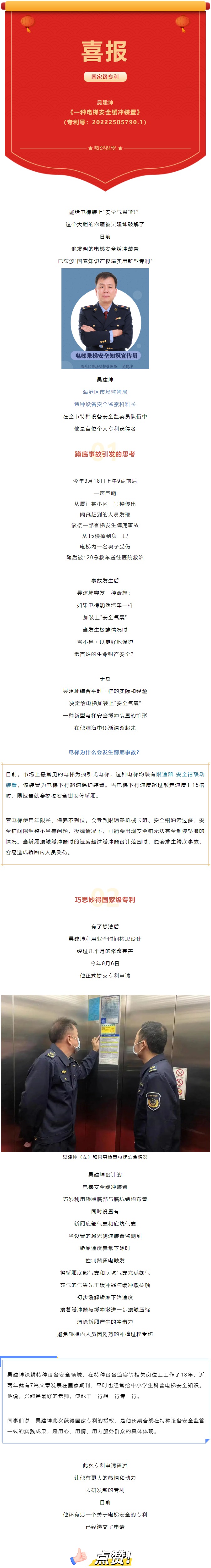 給電梯裝上"安全氣囊" 海滄區(qū)市場監(jiān)管局吳建坤首獲個人專利