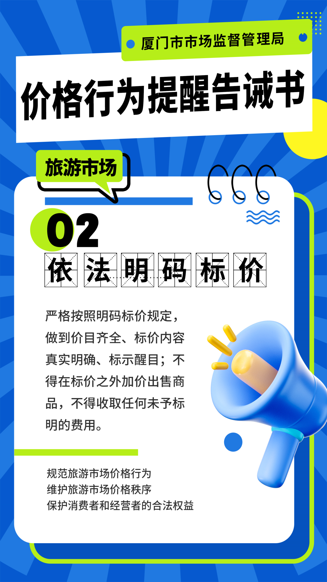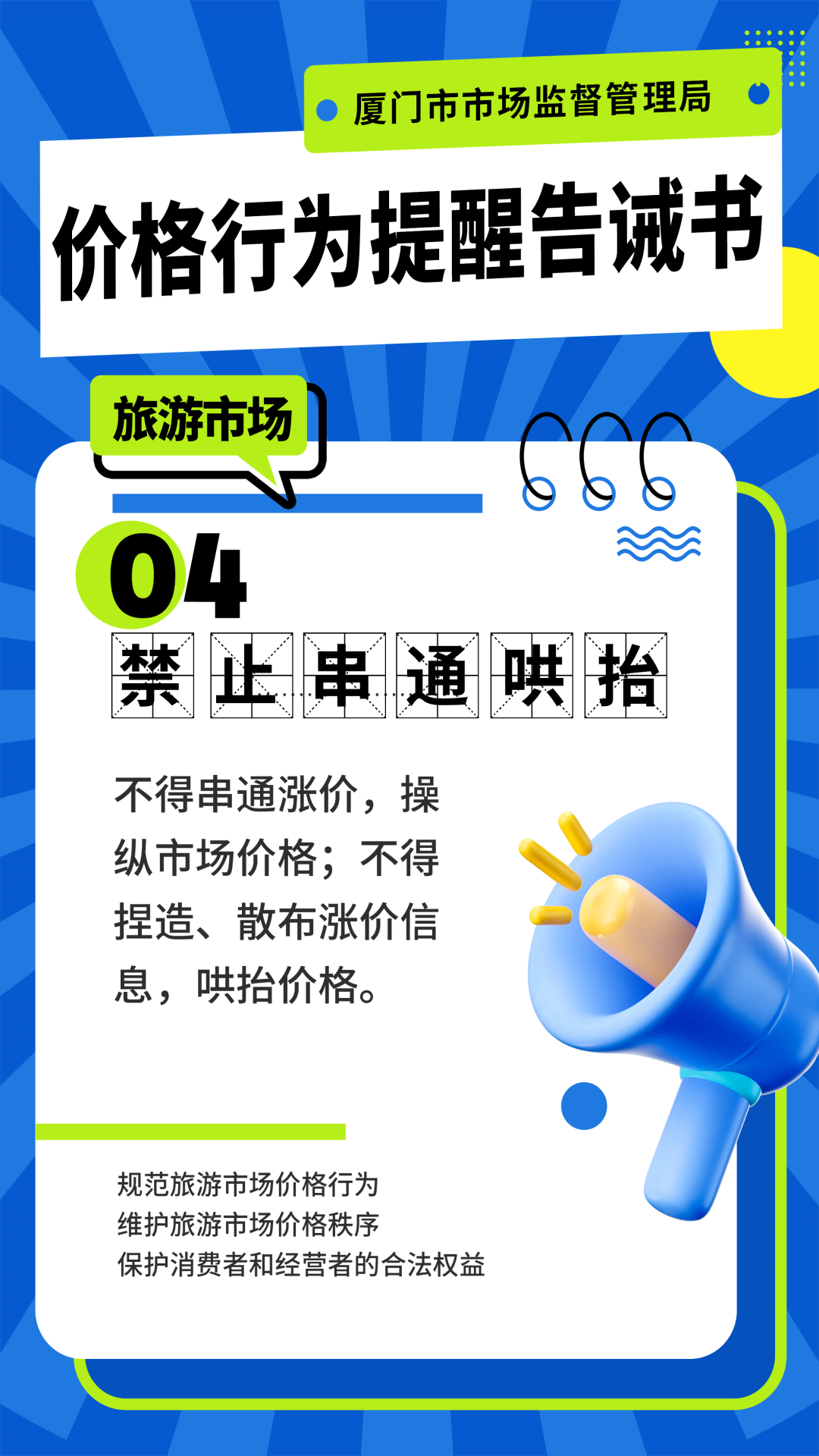 參會酒店、民宿協(xié)會和平臺經(jīng)營者也介紹了近期客房預訂及價格情況,各連鎖酒店假日期間客房價格受供求關系影響有較高幅度上漲,但均能落實明碼標價、誠信經(jīng)營,平臺企業(yè)也表示將落實主體責任,持續(xù)關注線上酒店客房價格形勢,及時啟動預警機制,保護好消費者權益。 現(xiàn)場,參會主體現(xiàn)場簽署價格行為合規(guī)承諾書,向社會公開承諾嚴格守法經(jīng)營,做到明碼標價、誠信經(jīng)營,合理定價,共同維護好廈門市旅游市場價格秩序。 下一步,市市場監(jiān)管局將進一步加大旅游市場價格監(jiān)督檢查力度,節(jié)日期間持續(xù)關注旅游市場價格形勢和投訴舉報情況,安排力量增加檢查頻次,嚴肅查處各類價格違法行為,及時查處和曝光情節(jié)嚴重、性質(zhì)惡劣的典型案例,營造良好旅游消費環(huán)境。 |