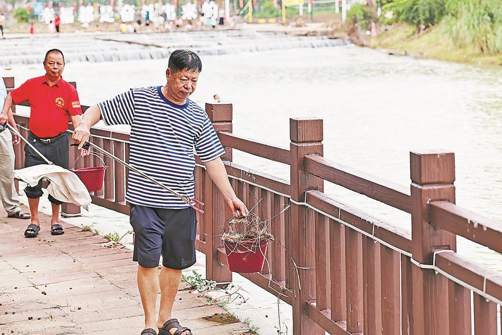 7月31日,一支由30多名退役軍人組成的“愛河護河”老兵巡河隊在泉州市洛江區(qū)羅溪鎮(zhèn)成立。 巡河隊主要承擔羅溪轄區(qū)內雙溪、后溪等河道的巡查工作,對河道及岸邊的可見垃圾進行及時清理,勸導群眾遠離河岸、深水區(qū),避免人員溺水,保障群眾安全,詮釋“退伍不褪色、退役不退志”的軍人本色和守護綠水青山的愛國衛(wèi)家情懷。圖為退役老兵在清理垃圾。 林升 攝影報道 |