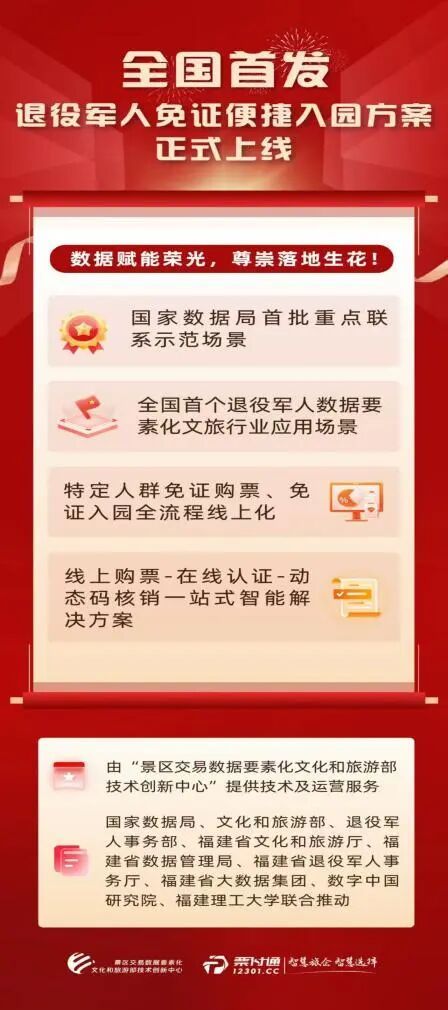 退役軍人在全國范圍內(nèi),到相關(guān)景區(qū)旅游“免證購票、免證入園”便捷服務(wù)正式上線了!這是我省數(shù)字化賦能退役軍人工作的最新實(shí)踐成果,更實(shí)現(xiàn)了全國首家跨區(qū)域優(yōu)待服務(wù)落地。 這項(xiàng)服務(wù)是由文化和旅游部、國家數(shù)據(jù)局聯(lián)合指導(dǎo),退役軍人事務(wù)部退役軍人信息中心大力支持,福建省退役軍人事務(wù)廳聯(lián)合福建省文化和旅游廳、福建省數(shù)據(jù)管理局、福建省大數(shù)據(jù)集團(tuán)、景區(qū)交易數(shù)據(jù)要素化文化和旅游部技術(shù)創(chuàng)新中心等單位共同推動(dòng)實(shí)施,核心是依托福建成熟的“數(shù)字身份+數(shù)據(jù)共享”體系,打破傳統(tǒng)“實(shí)體證核驗(yàn)”局限,全國退役軍人無需出示任何身份證明材料,即可在全國接入“景旅縱橫”微信小程序的景區(qū)暢享“免證購票、免證入園”便捷服務(wù)體驗(yàn)。