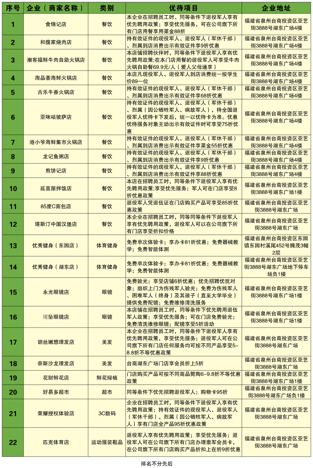 作為泉州臺(tái)商投資區(qū)首個(gè)商業(yè)綜合體擁軍示范點(diǎn),湖東廣場(chǎng)“擁軍商場(chǎng)”首批匯聚了21家優(yōu)質(zhì)商戶資源,將為現(xiàn)役、退役軍人及其他優(yōu)撫對(duì)象提供“優(yōu)質(zhì)產(chǎn)品、優(yōu)先待遇、優(yōu)惠價(jià)格”的“三優(yōu)”服務(wù),凡現(xiàn)役、退役軍人及其他優(yōu)撫對(duì)象持相關(guān)證件,即可享受消費(fèi)折扣等相關(guān)優(yōu)惠。 首批“擁軍門店”清單