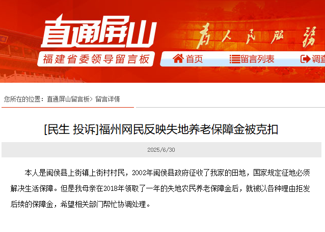 近日,福州閩侯網(wǎng)友林先生通過《直通屏山》反映,當(dāng)?shù)夭簧俅迕裨谡鞯睾笞孕袇⒓恿遂`活就業(yè)人員養(yǎng)老保險,到退休年齡時,當(dāng)?shù)貐s以此為由不予發(fā)放被征地農(nóng)民養(yǎng)老保障金,亦未給予自繳保費補(bǔ)貼。福州多地存在類似情況,林先生認(rèn)為,此舉剝奪了失地農(nóng)民的合法權(quán)益,違背了中央政策精神與省級規(guī)定。